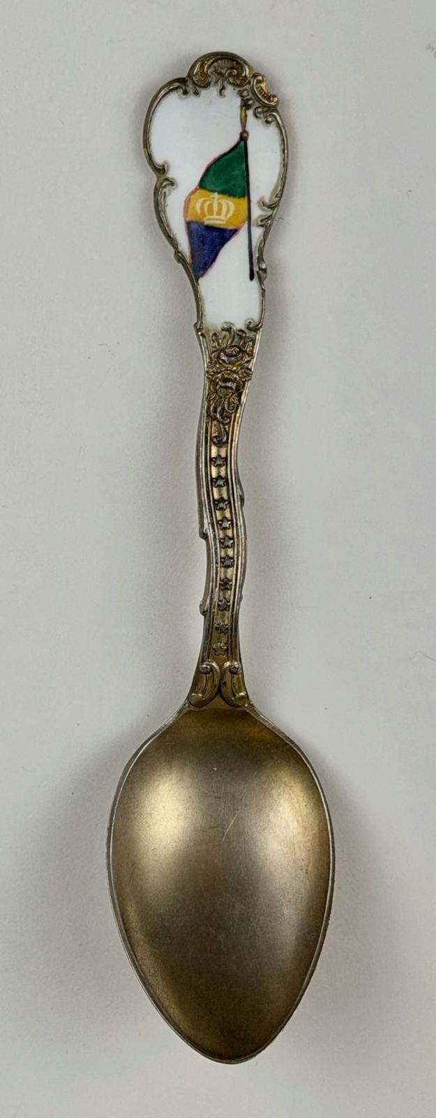 This spoon features a white enameled handle on which is painted a green, yellow, and blue flag with a white crown in the center. The significance of the flag design is unknown. There is no other decoration or writing on the spoon that establishes any particular identity.
