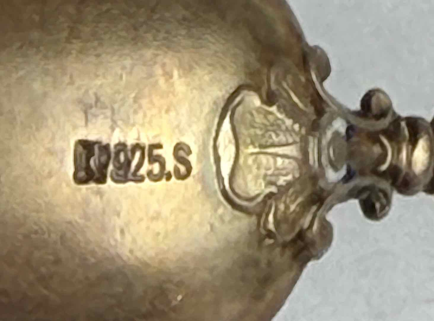 This spoon likely celebrates the several states added to the Union in 1889 and 1890. The handle tip displays and eagle with an America shield. The bowl has an American flag. That flag has white stripes where red belong and vice versa. Also, a leafy sprig partially covers a row of stars, leaving 38 visible. The 38-star flag had a blue field with five rows of stars, not forming a perfect square, but not off-center as on the spoon.