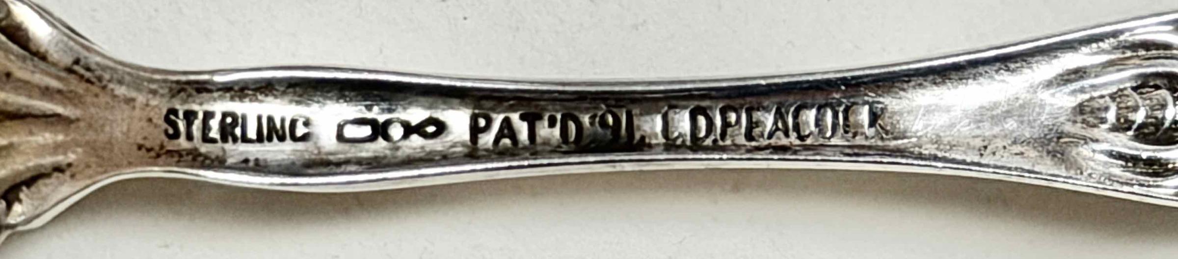 “CHICAGO / 1871” is on the handle. “STERLING,” maker touchmarks, and “PAT’D.91 C.D.PEACOCK” are on the back of the handle.