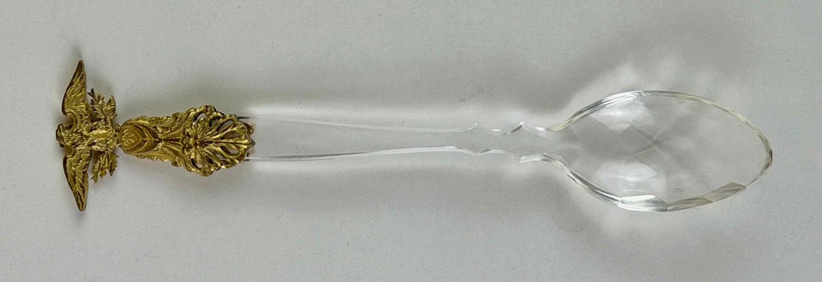 This unmarked spoon is made of cut glass with a stamped eagle attached to the tip of the handle. The eagle appears to hold arrows in one talon and laurel leaves in the other, suggesting that this symbol is of the United States, although eagles were common decorative motifs in many European countries. The base of the metal tip is a classical anthemion. The outside bottom of the bowl is cut with diamond facets.