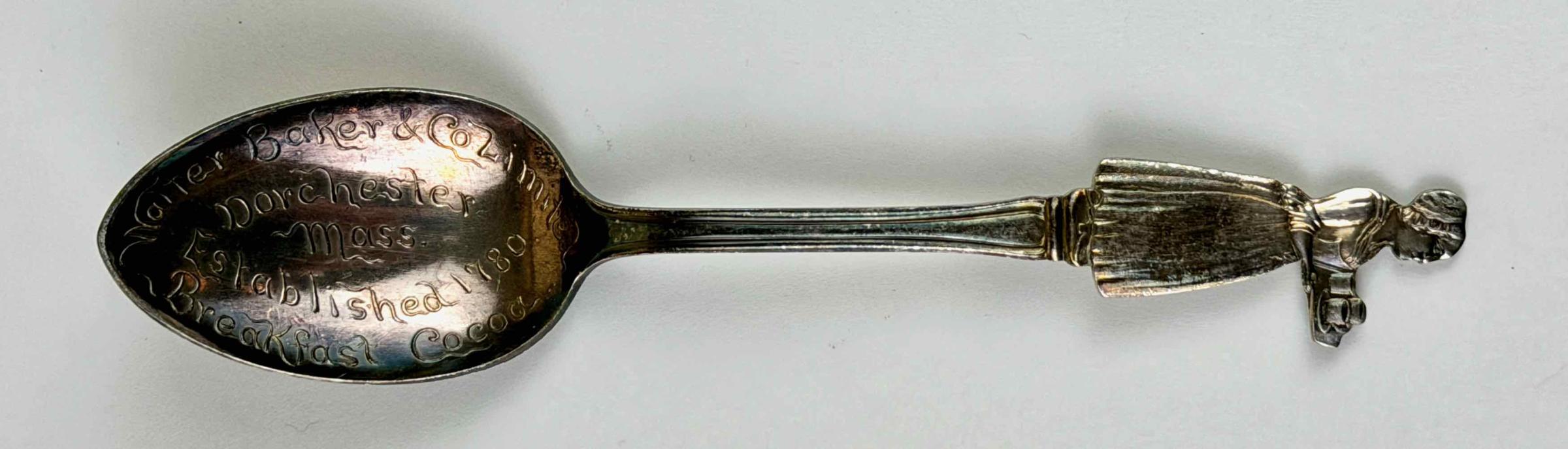 This spoon celebrates a particular business in Dorchester, Massachusetts: the Walter Baker & Company, which was the largest producer of chocolate in the country. According to the inscription in the bowl, the business was established in 1780, but histories of the company disclose that that date marked the consolidation of two closely related businesses. The business was incorporated as Walter Baker & Co. Limited in 1895, which likely inspired the offering of the spoon. In 1927, the company was acquired by General Foods.