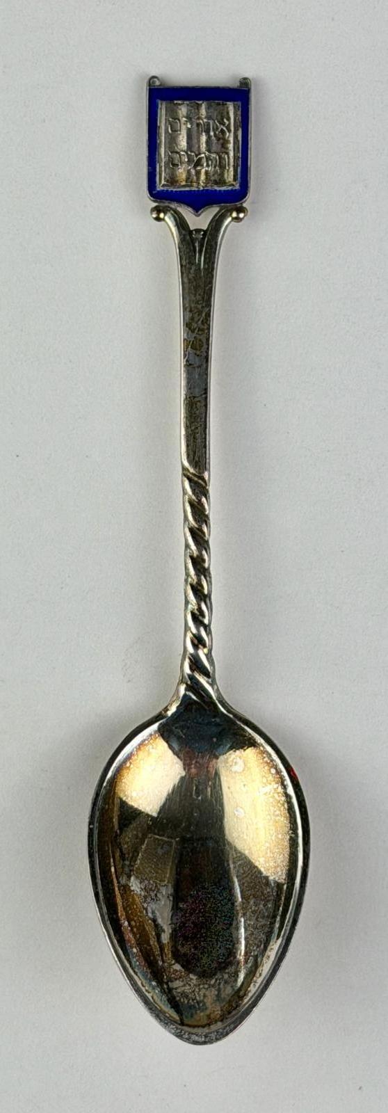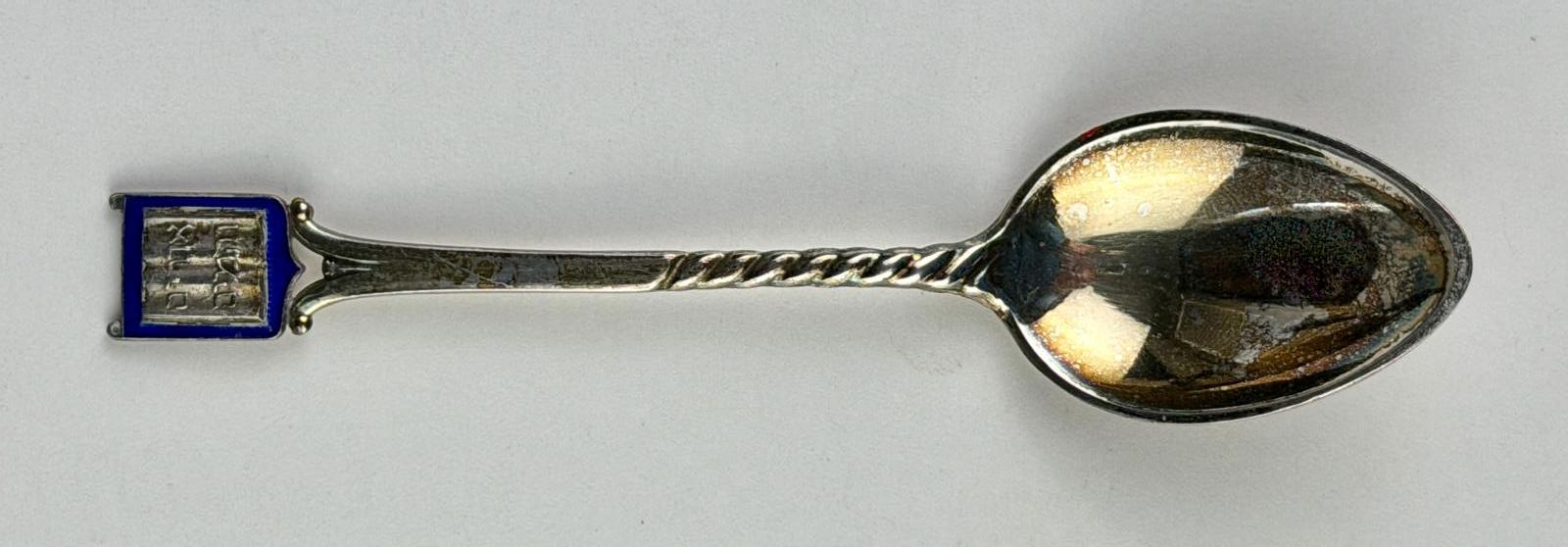 The only "souvenir"-like decoration on this spoon appears at the handle tip. It has a square panel with an outlining band in deep blue that encloses what appear to be Hebrew letters referencing "Light and Life" or "Light of Life." The lower half of the handle has been modeled to suggest it has been twisted, although the back of the handle, where it was marked by the maker and retailer, is flat.