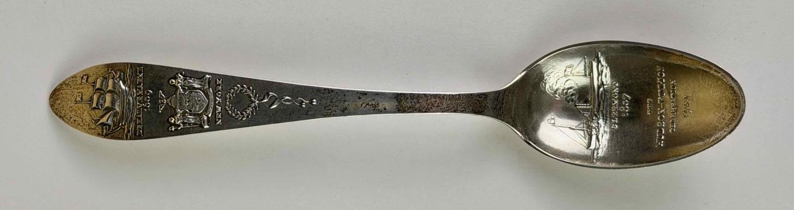 The spoon honors the 1909 Hudson-Fulton Celebration with an image of "De Halve Maene," i.e., The Half Moon, the Dutch East India Company three-masted ship captained by Henry Hudson sent to search for a Northwest Passage in 1609. The spoon bowl features an image of Robert Fulton's The Clermont. It was the world's first steamboat to be put into public service. It was built in New York City for use on the Hudson River between the city and Albany.