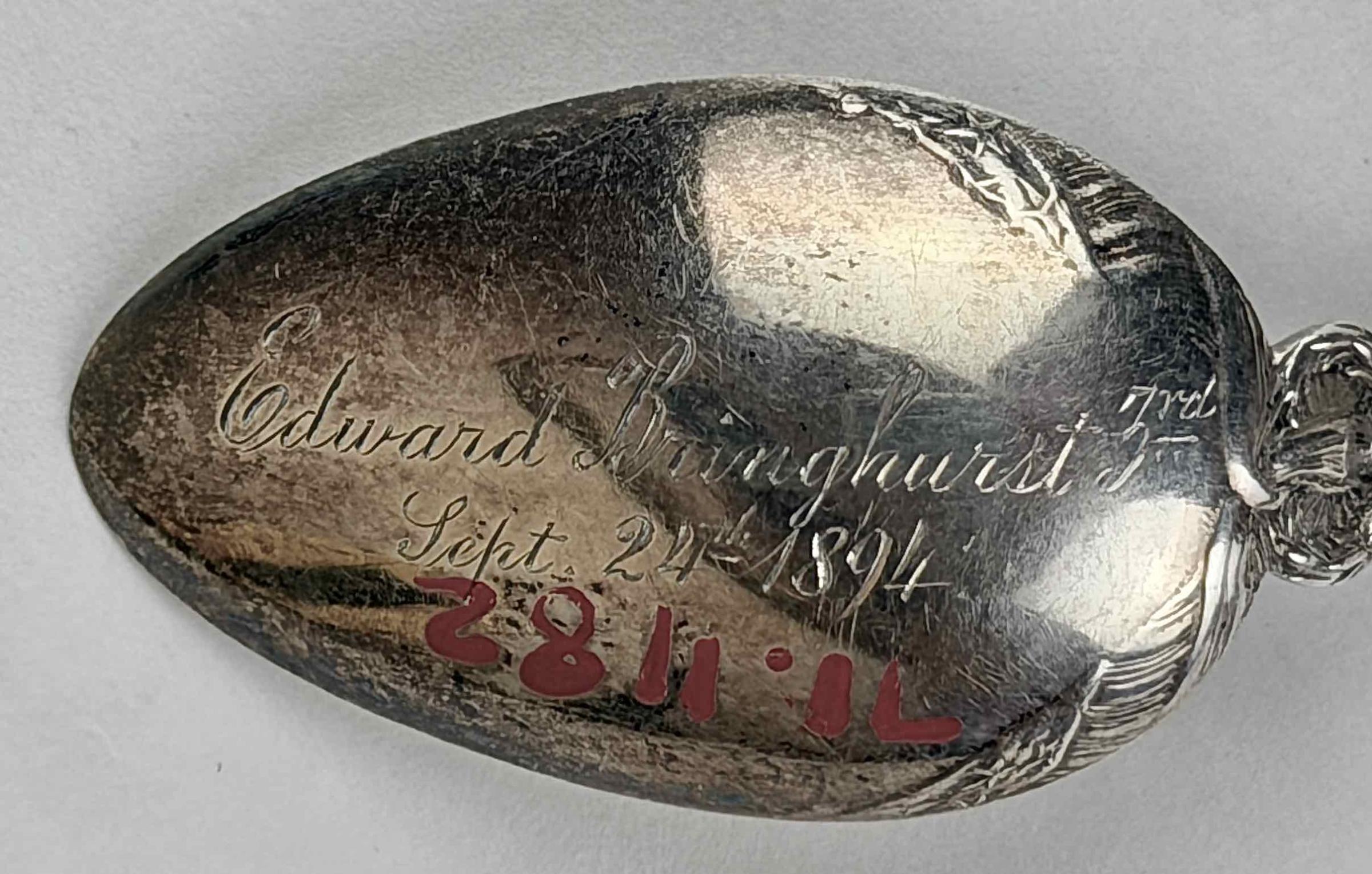 Edward Bringhurst III (1884-1939), who’s name is engraved on the outside bottom of the bowl along with the 1894 date, lived in the Rockwood Mansion in Wilmington and must have known Mary Corbit Warner, the donor. However, the circumstances surrounding the engraving are not known.