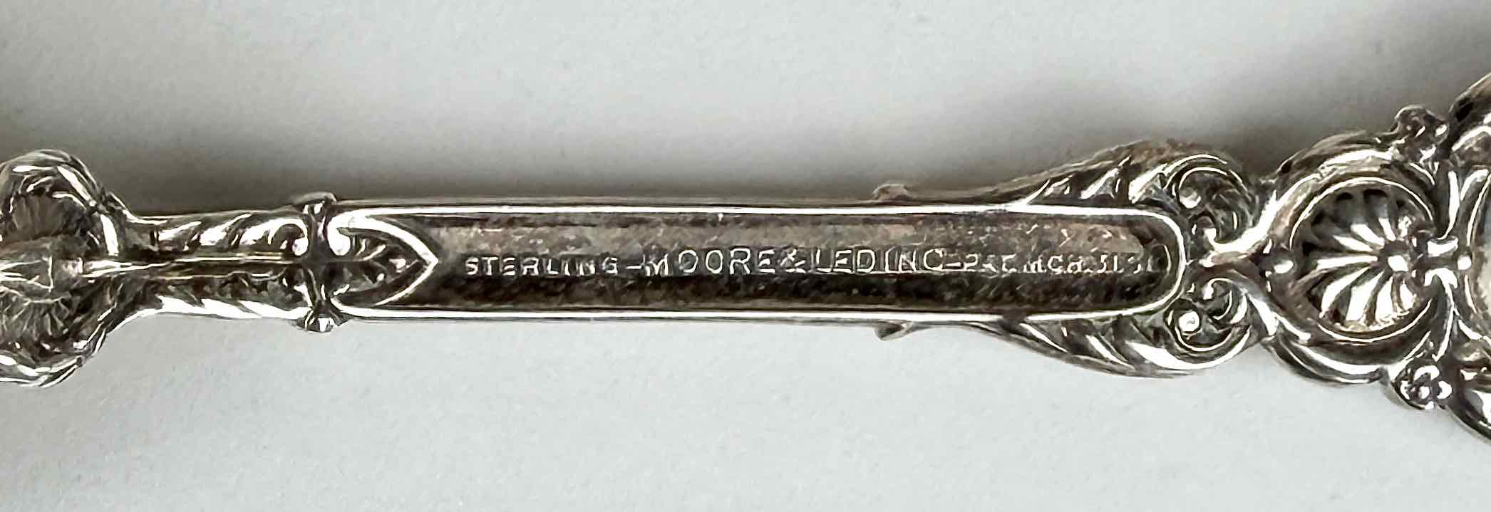 “1759 / 1799” and “Mount Vernon” is on the handle. "STERLING" and "MOORE & LEDING—PAT MCH.31.91." [March 31, 1891] is on the back of the handle. “Edward Bringhurst 3rd / Sept 24th 1894” is engraved on the outside bottom of the bowl.
