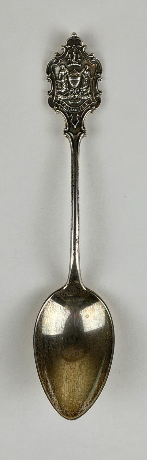 The spoon features a large and detailed cartouche at the end of the handle displaying the seal or coat-of-arms of Philadelphia.