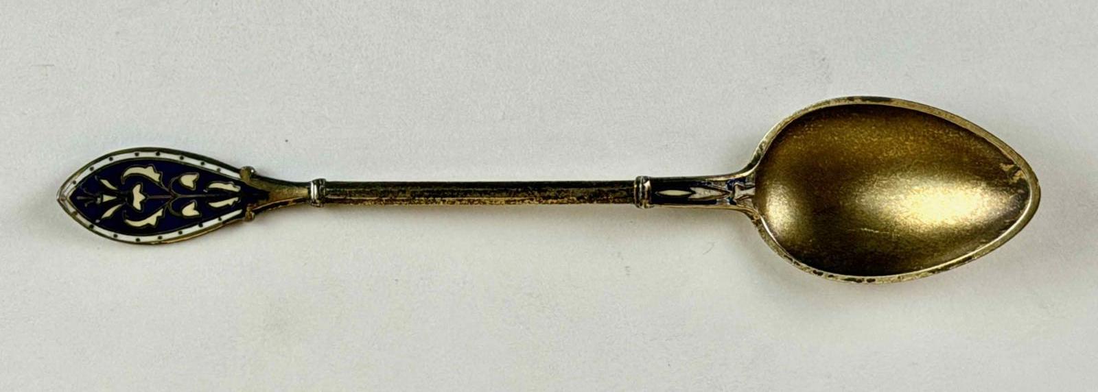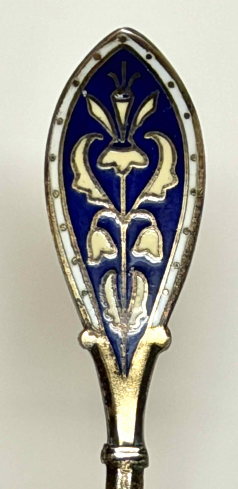 The spoon has a handle tip decorated with a cloisonné image of a stylized flower against a blue background and within a white border. In cloisonné, raised walls or barriers control the flow of enamels. A bit more cloisonné decoration occurs on the handle next to the bowl.