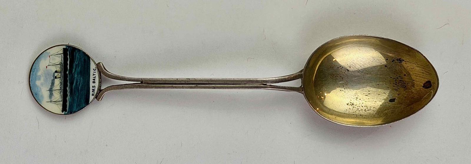 “R.M.S. BALTIC” is across the bottom of the roundel at the handle tip showing the ship. Touchmarks on the back of the handle include the Birmingham anchor and lion, a Birmingham date letter "e" for 1904, and a "RC" or "RG" touchmark for the maker.