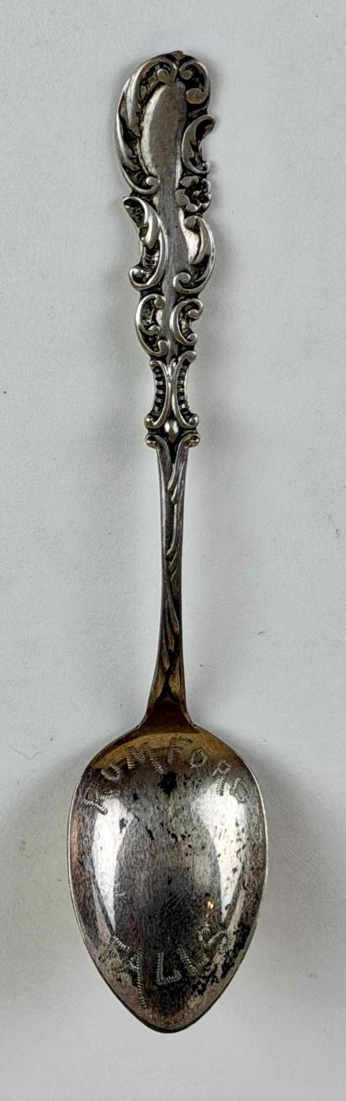 The spoon, with an ornate handle decorated with many C scrolls, has a plain bowl bearing the name Rumford Falls. The dramatic falls, on the Androscoggin River in Maine, are in Rumford, a small town midway between Portland and the Canadian border to the northwest. Access to the town must have been a challenge until a paper manufacturing mill was established there in 1893. Rail connection followed, as did prosperity for the town.