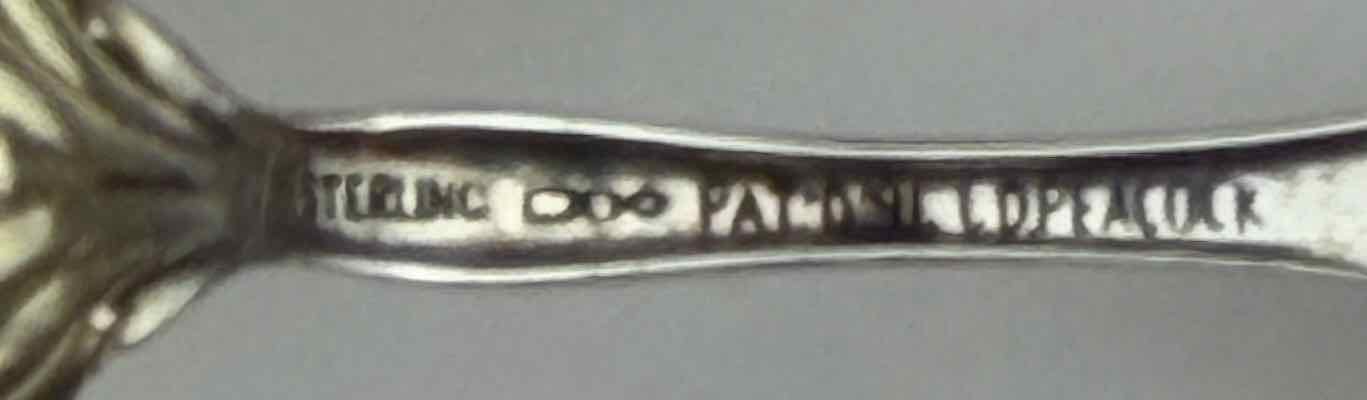 “SALEM 1692” runs along the handle near the bowl. “DANIEL LOW” with Gorham touchmarks and “STERLING” are on the back of the bowl near the handle.