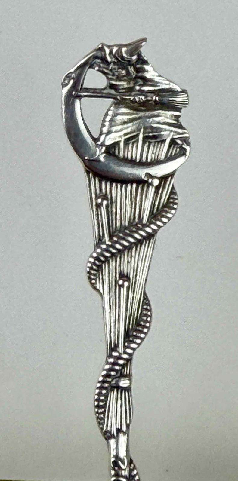 Because the spoon carries the date 1692, when the Salem witches were tried, some researchers have assumed this spoon version celebrated the 300th anniversary. However, the design, one of two concurrent versions executed by Daniel Low, was published in 1891. See Anton Hardt’s 1962 reprint entitled Souvenir Spoons of the 90’s: As Pictured and Described in “The Jewelers’ Circular” & The James Catalogue in 1891 (New York: the author, 1962), pp. 21, 22.