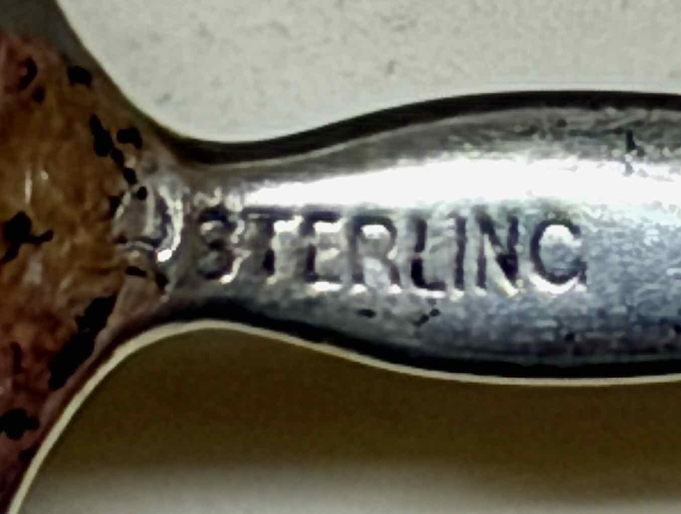 “STERLING” is preceded by a maker’s mark, probably a lion passant, on the back of the handle.