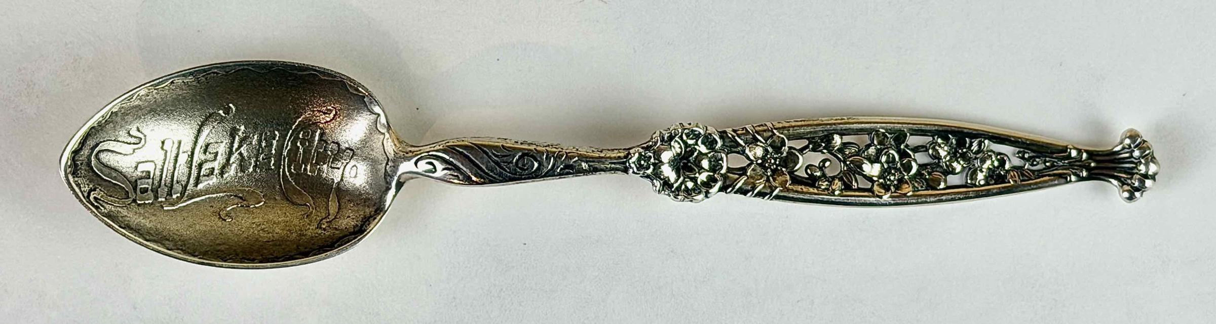 The only evidence of a place associated with this spoon is the Salt Lake City name prominently in the bowl. The handle is an intricately sculpted design with piercings that emphasize the floral vine in the handle. A large flower separates the pierced section from the simpler incised part near the bowl. The handle tip has a distinctive motif of five fanned ribs with balls at the tip of each. Features of the handle design support the likely maker.