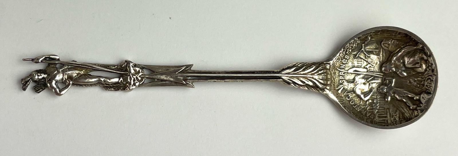 Saratoga Springs, known for its mineral waters, has been a resort destination throughout much of the 19th century and later. Mohawk, Abenaki, Mohican, and other Native American tribes inhabited the area beforehand. The spoon acknowledges Indian presence with a well-modeled full-body representation of a male holding a bow and wearing a quiver of arrows. The spoon handle is formed by a clutch of four arrows, the feathers of which join the ovoid bowl. The bowl is richly sculpted with various Indian-related images.