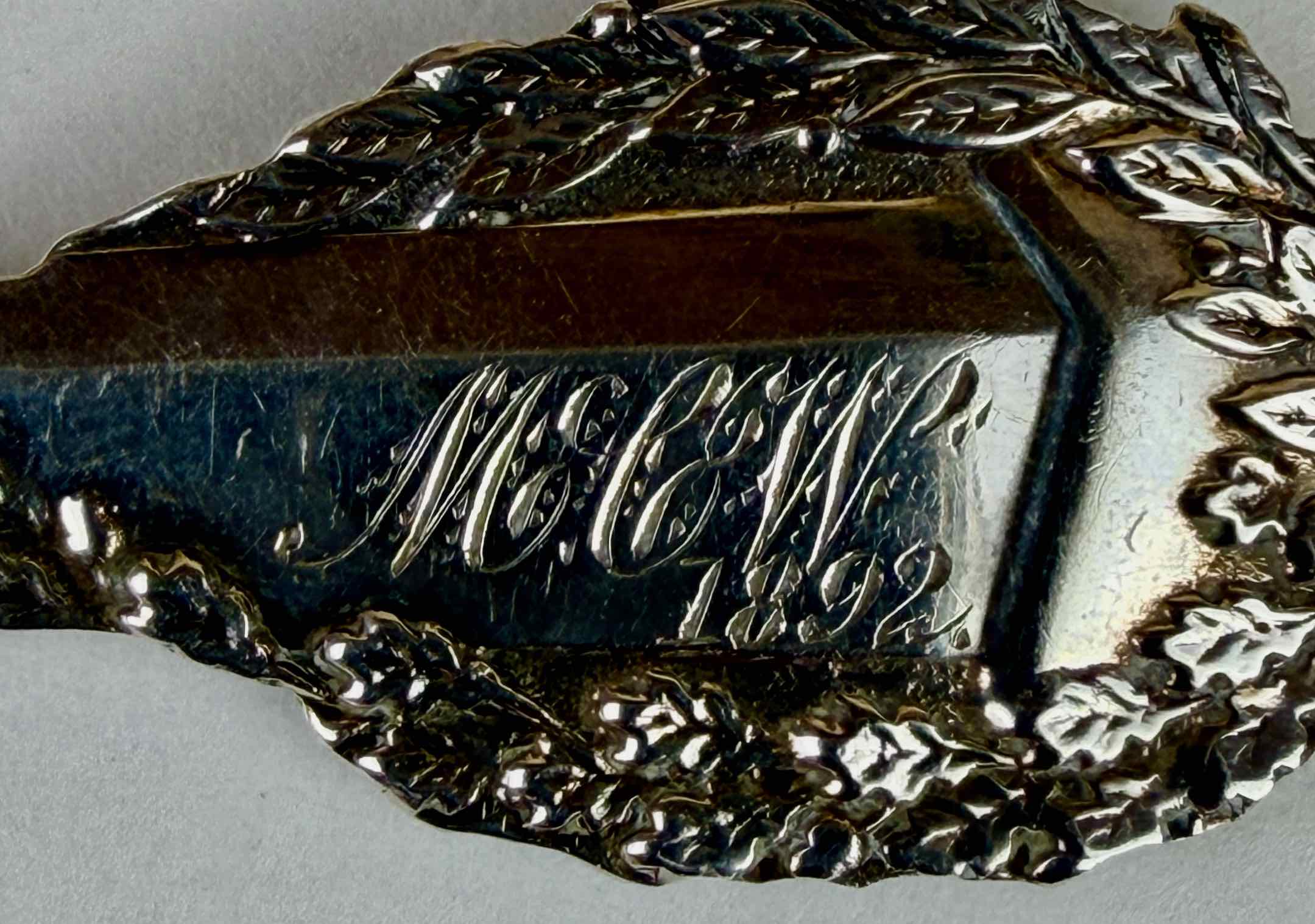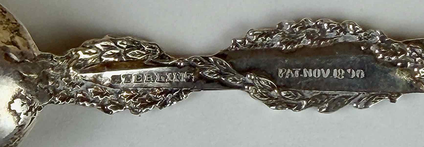 “M.C.W. / 1892” is engraved on the back of the handle tip. "STERLING” and “PAT.NOV.18.90" are stamped into the back of the handle.
