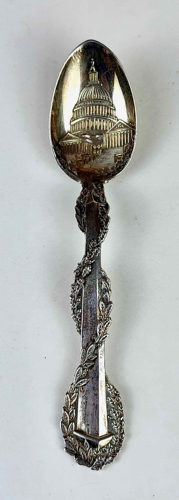 The spoon handle is a representation of the Washington Monument, completed in 1884. It is shown wrapped with a laurel vine that ends along the adjacent border of the bowl. The Capitol building is shown inside the bowl. The spoon design is unusual in that it places the bowl at the top rather than the bottom or to one side.