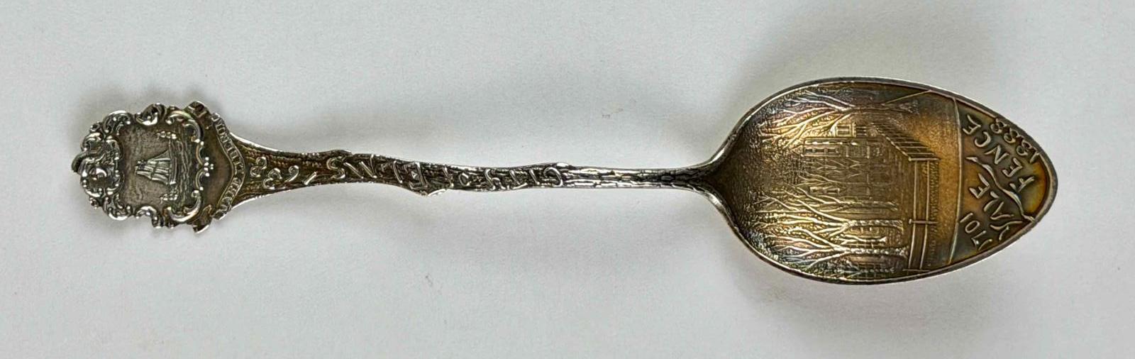 This spoon celebrates the Yale Fence, a venerable rail fence originally built in 1833 that became a symbol of the college (founded in 1701). An image of the fence is shown in the bowl in front of a line of trees with a Yale “Old Campus” building behind them. The fence was removed in 1888 to make room for yet another new building on the Old Campus.