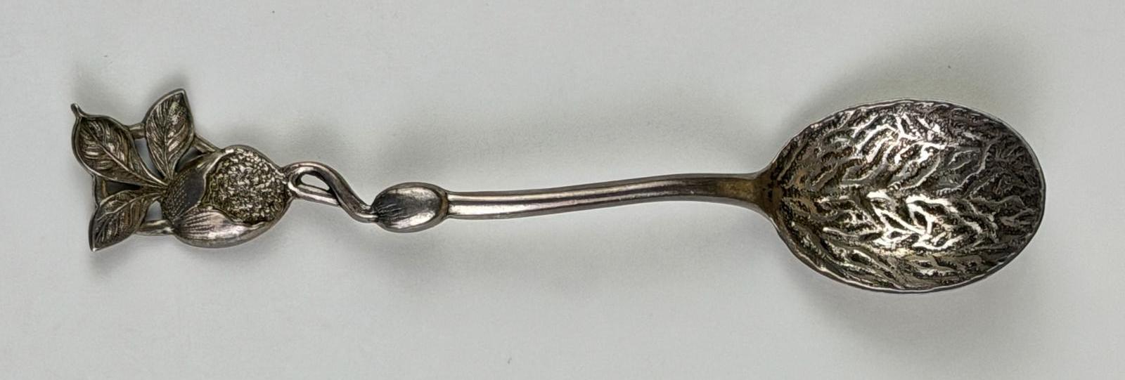 The spoon has a bowl that looks like a nutmeg or possibly a walnut. The foliate handle, however, represents nutmeg greenery. It is illustrated and discussed in Anton Hardt, Souvenir Spoons of America (1891), pp. 8-9. Connecticut is the nutmeg state. Hardt stated, "Hansel, Sloan & Co., Hartford, Conn., control the manufacture and sale of this spoon."