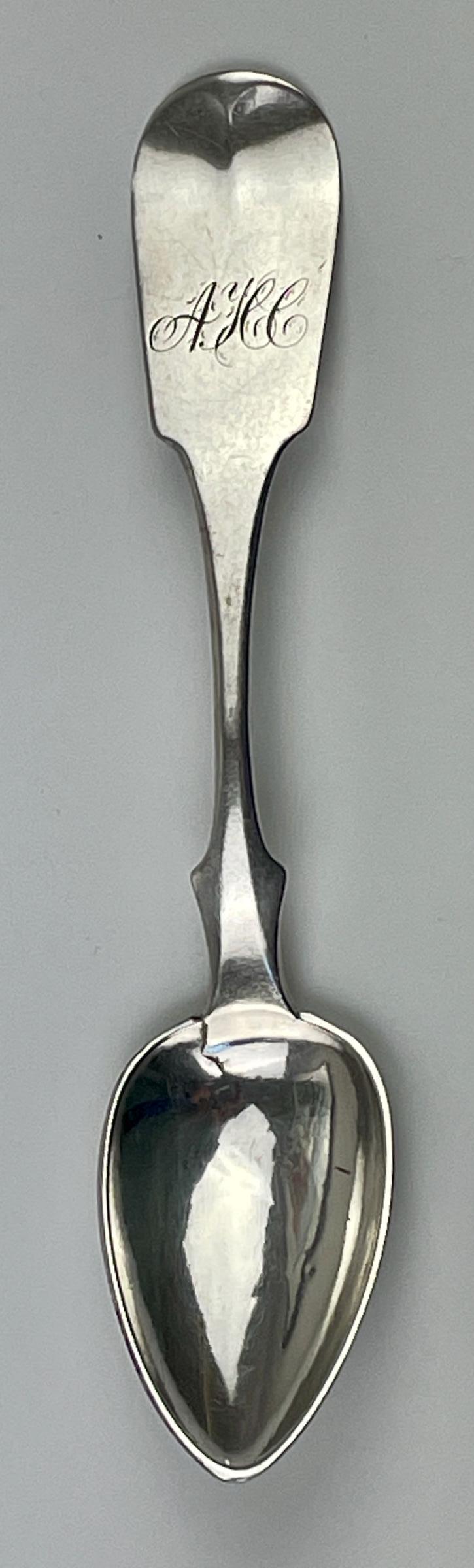 The tea spoons have pointed oval bowls and fiddleback handles that turn upward at the tip. The initials AHC engraved into the handle have not been identified. The maker’s mark stamped into the spoons dates them between 1850 and 1854. The individual for whom the spoons were made may have been a Corbit or may have been from another family beginning with "C" that married into the Corbit family.