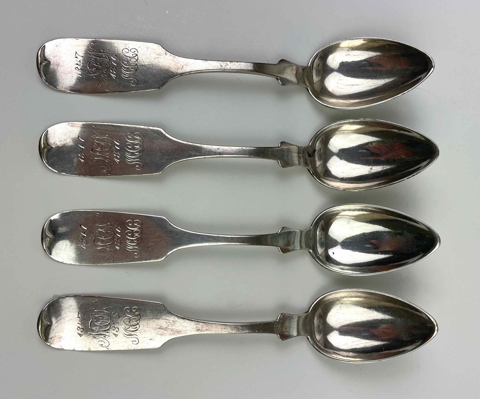 The teaspoons have pointed oval bowls and fiddleback handles that turn upward at the tip. They are marked J F Robinson, likely silversmith John, but he had a brother Jacob F. Robinson (1819-1867), who also may have been a silversmith, although recent research shies away from him. See Donald F. Fennimore, Delaware Silver: the Col. Kenneth P. & Regina I. Brown Collection (Dover, Del.: Biggs Museum of American Art, 2008), p. 254. John Robinson worked from 1837 to 1857, when he sold his tools, stock, and shop to his sister.