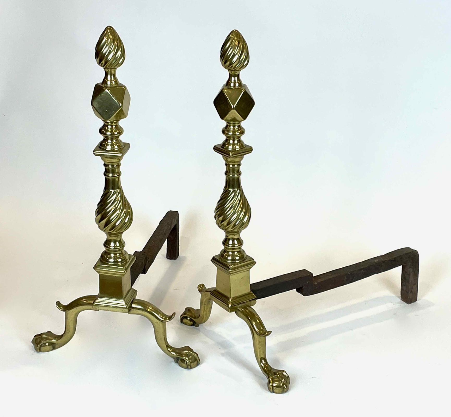 These striking andirons capture the intricacies of reflected light. The uppermost element, a swirled flame is above a faceted ball. Below, a swirled or spiral baluster is atop a plinth. The cabriole legs with ball-and-claw feet feature upturned spurs at the knee.