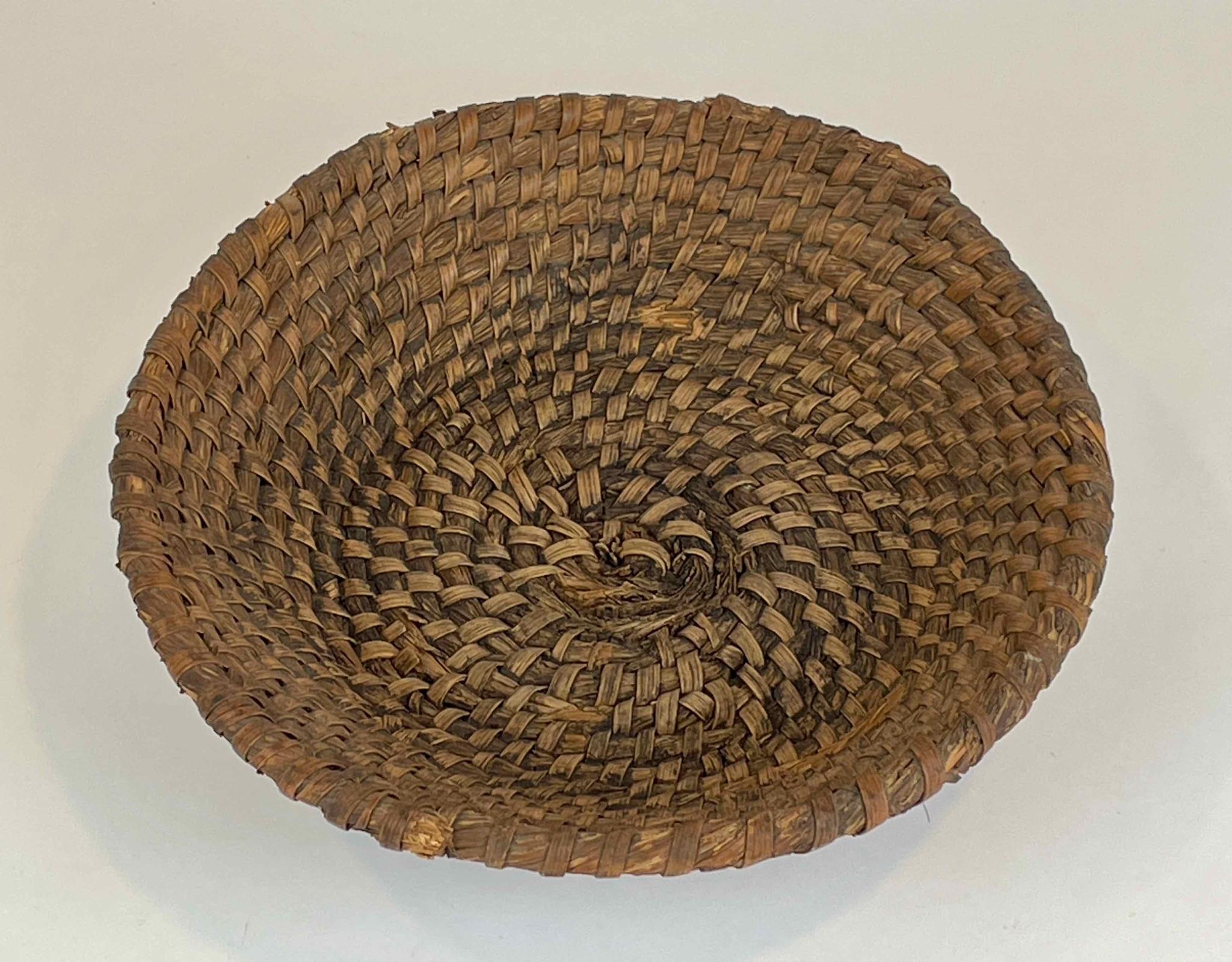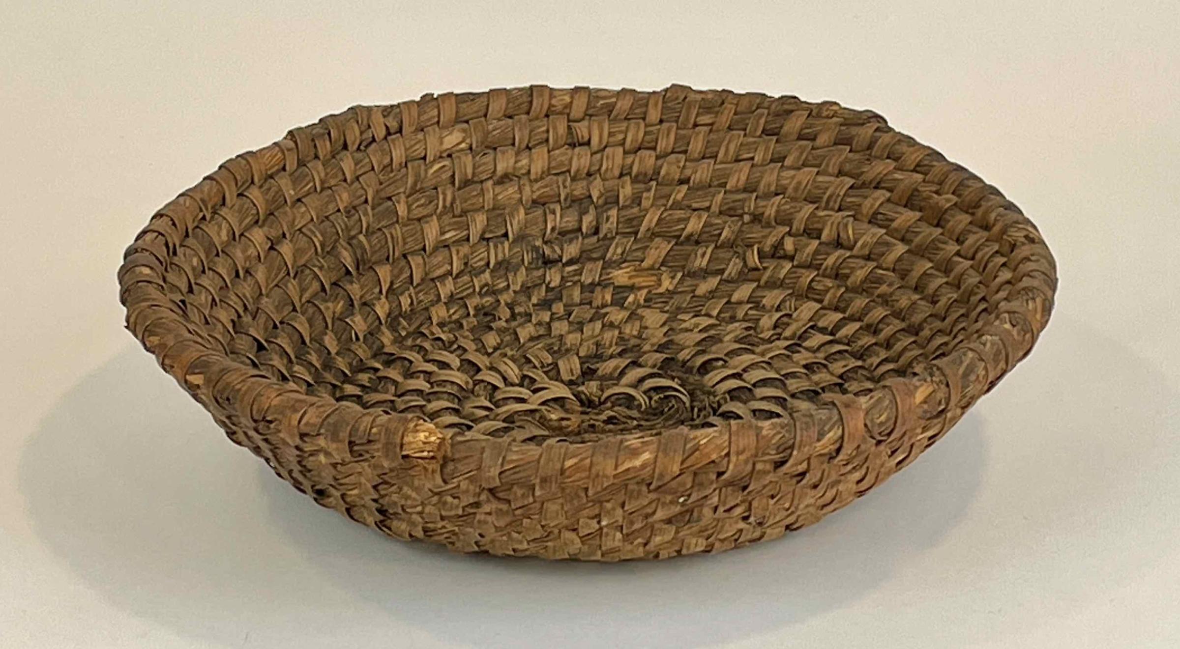 The basket is made of twisted rye straw roping coiled into a shallow basket with outward canted sides. Narrow pieces of splint are woven into the coils and hold them in place. Inspection of the uppermost length of roping shows where handles are now missing from opposite sides.