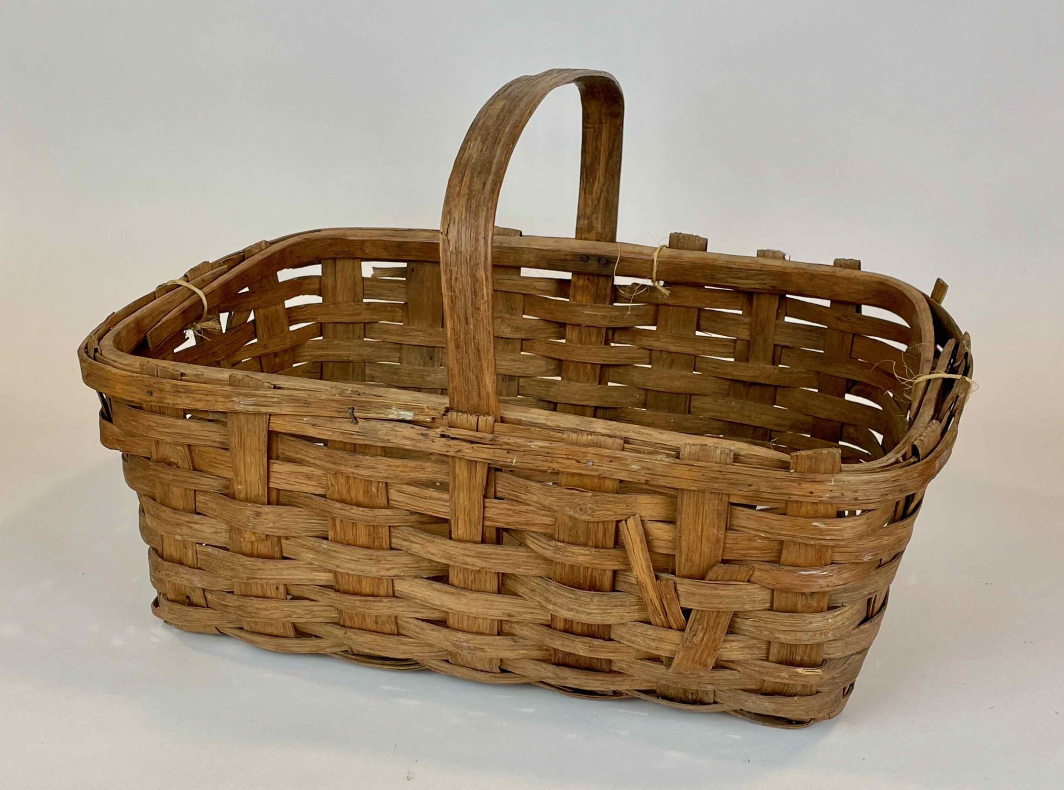 The rectangular basket with a strap handle joining the middle of the two long sides is made of woven splints of hickory. Wider splints form ribs around which are woven narrow straps. The rim is formed by inside and outside straps that are secured by wire nails.