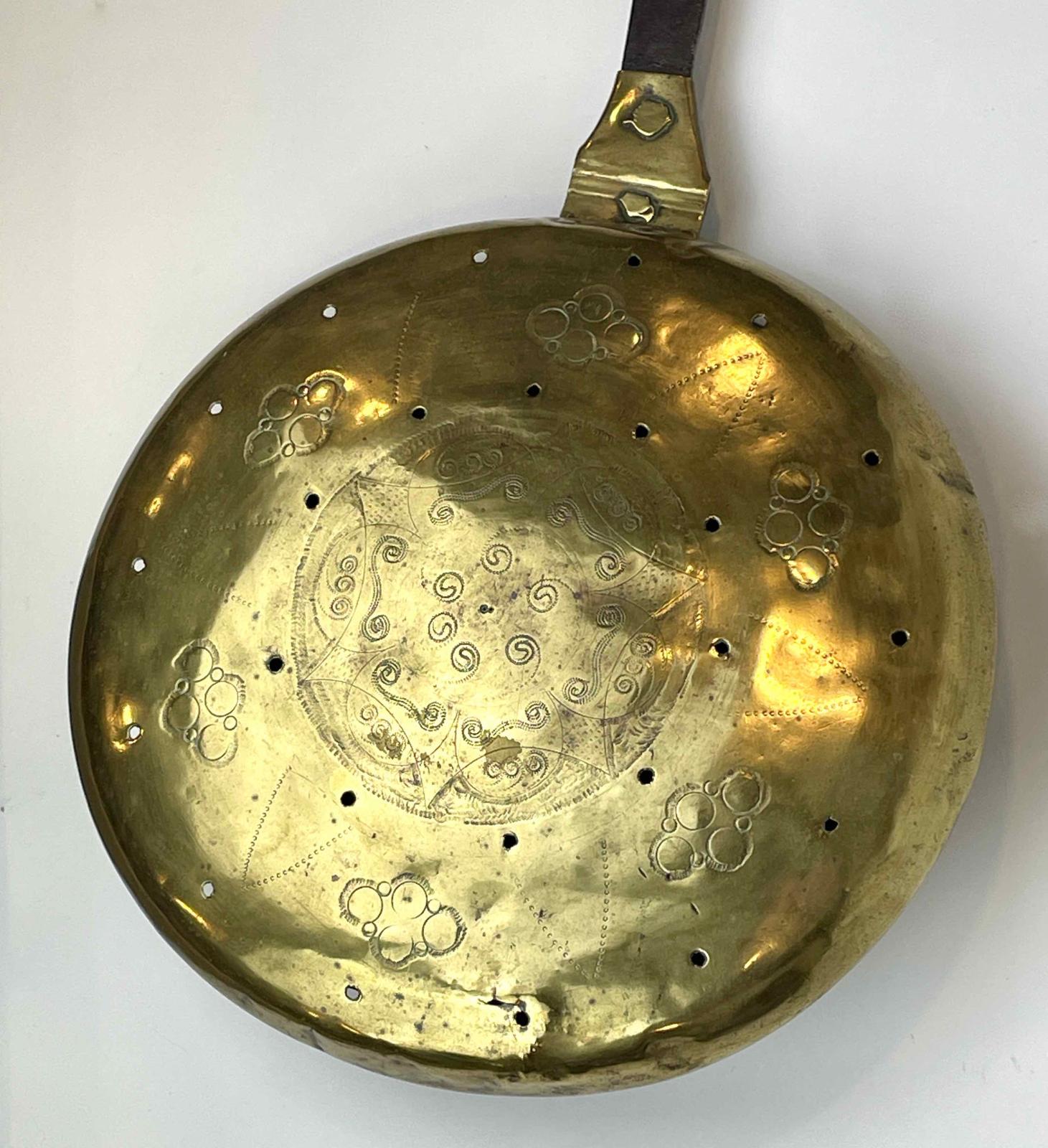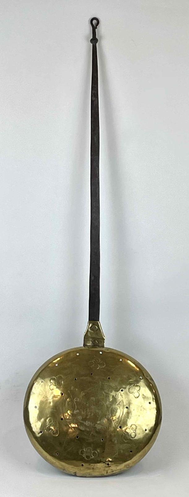This bed warmer, also called a warming pan, has a domed brass lid that overhangs the iron frame supporting a brass pan for hot embers. The rolled edge of the lid is bent over an iron wire core. The punchwork and engraved lid attaches with a three-part hinge. The lid decoration has six repeats of cones and clusters of circles arranged around a central boss of scrolls and coils, linking it to accession no. 1971.917. Both warmers have long, flat iron handles with a knop near the end, which appears to have been slipped onto the handle. The handle end loops around to form a hanging hook. A single brass rivet attaches the handle to a tab on the pan. Both warmers may have been made in London in the same shop or close artisan community.