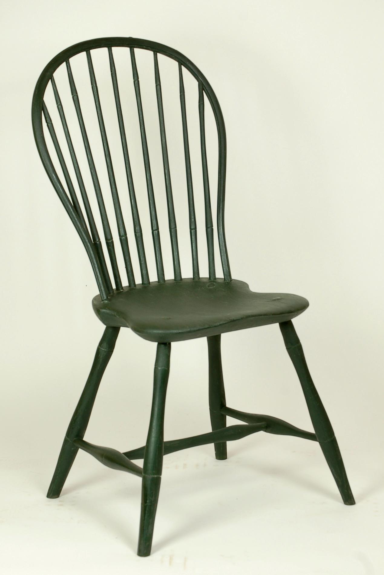The deeply curved bow of the Windsor side chair (1973.384.2 was photographed for this record) encloses nine spindles, each of which swells near the bottom and near the top. The bow itself has strong reverse curves immediately above where it joins the carved shield-shape seat. The four legs are bamboo-turned. The side stretchers swell in the center, and the medial stretcher swells near each end.