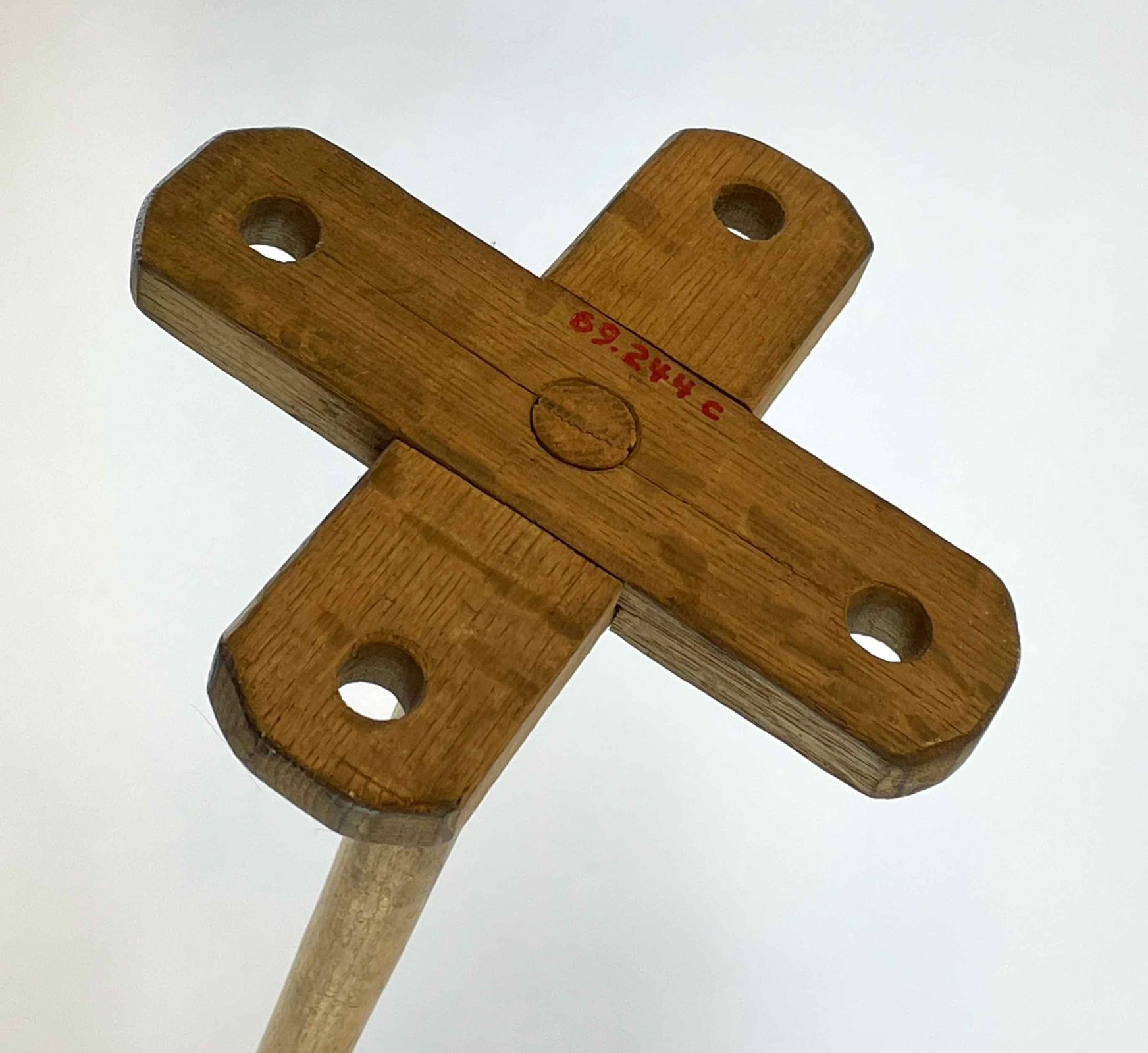 The paddle has a long pole handle that has darkened with use, except below the lid where it is not handled. The end of the paddle has crossed blades, each of which has rounded ends and a hole in the center. The lapped blades slide onto the end of the pole and are wedged in place.