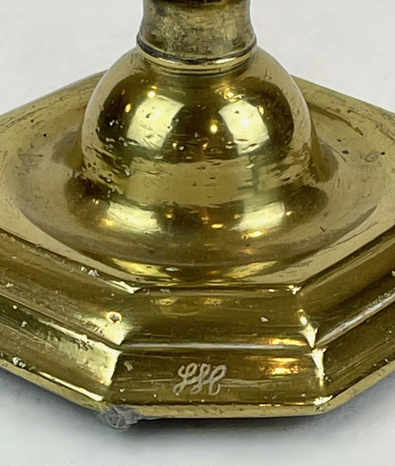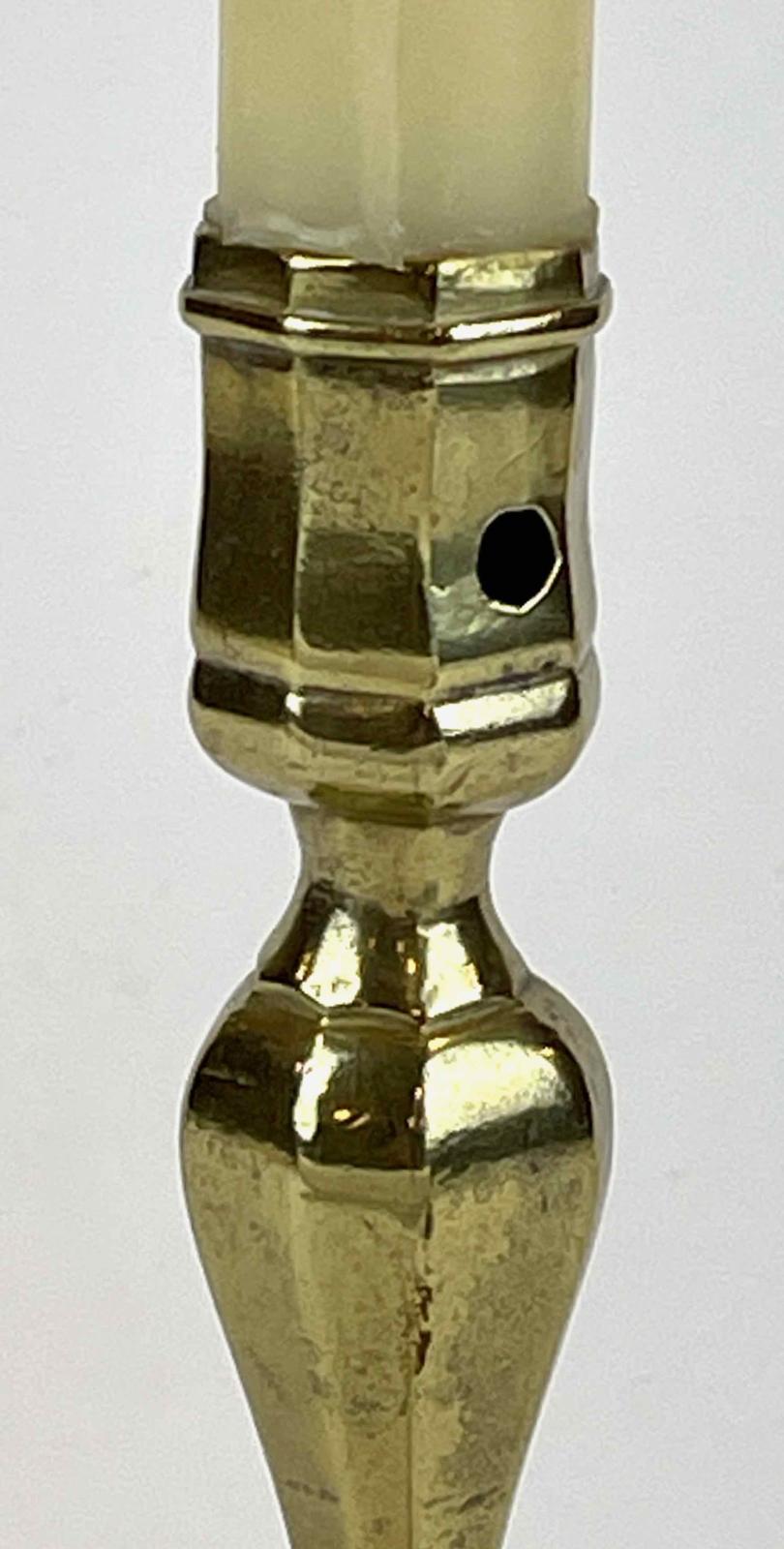 This candlestick has an octagonal candle socket with no drip pan. The octagonal theme continues through the inverted baluster shaft and to the base, which is square with chamfered corners. The candle socket has a hole in one side to allow a sharp object to be inserted to lever up the candle stub, a task that ejectors accomplished in later candlesticks. The shaft shows no evidence of having been cast in halves. The casting itself is relatively heavy.