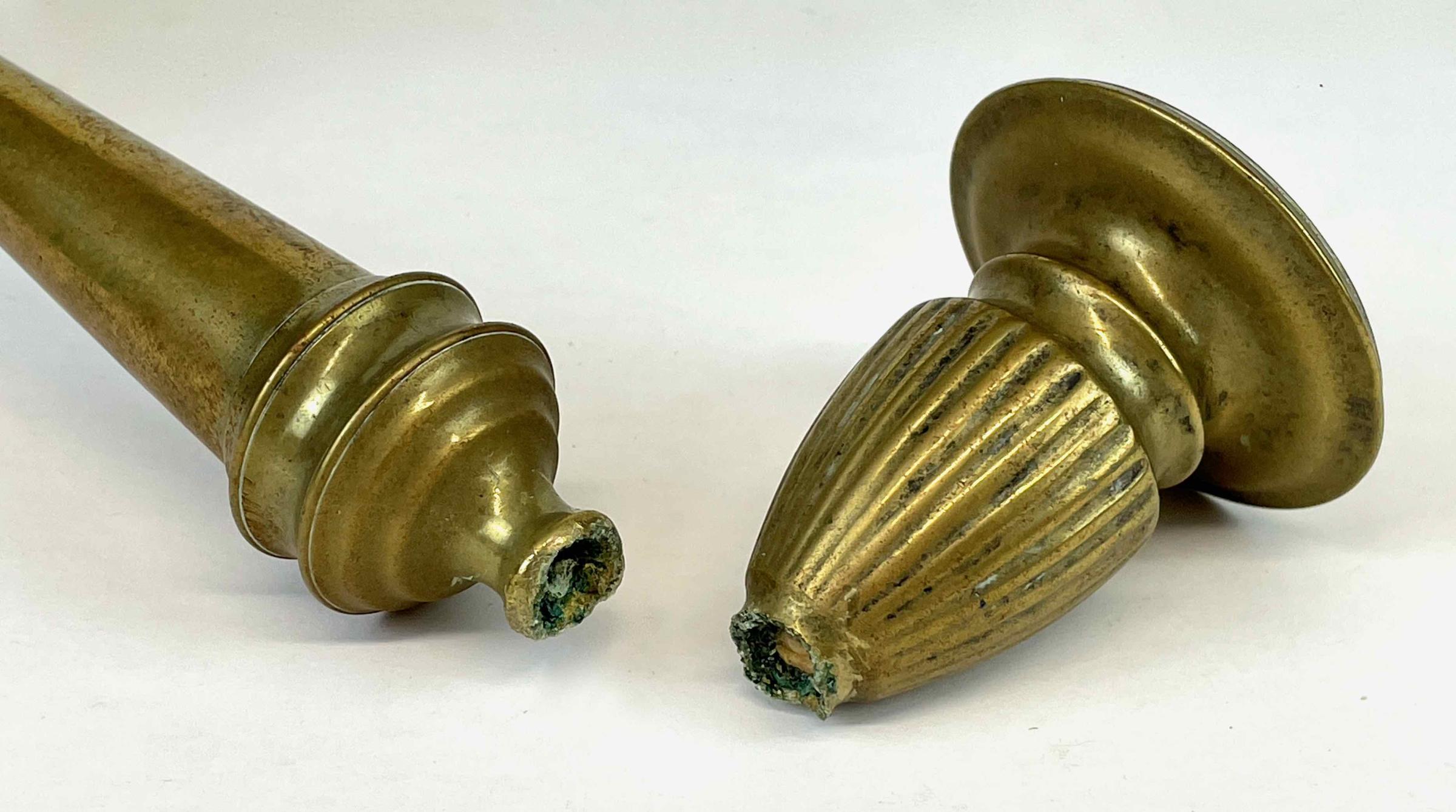 The candlestick was broken apart just below the urn-shaped candle socket. The break occurred before 1971. It was restored in January 2026.