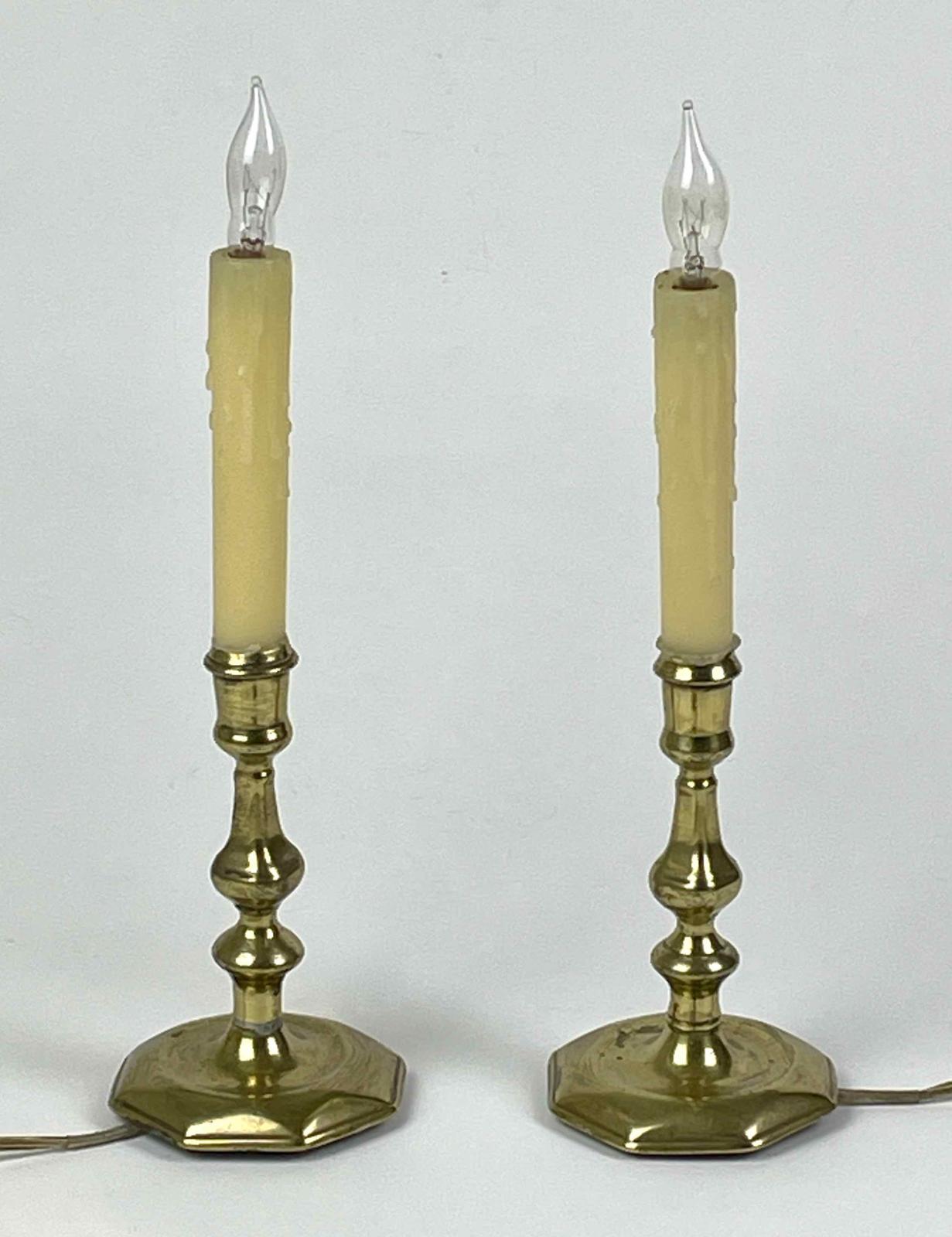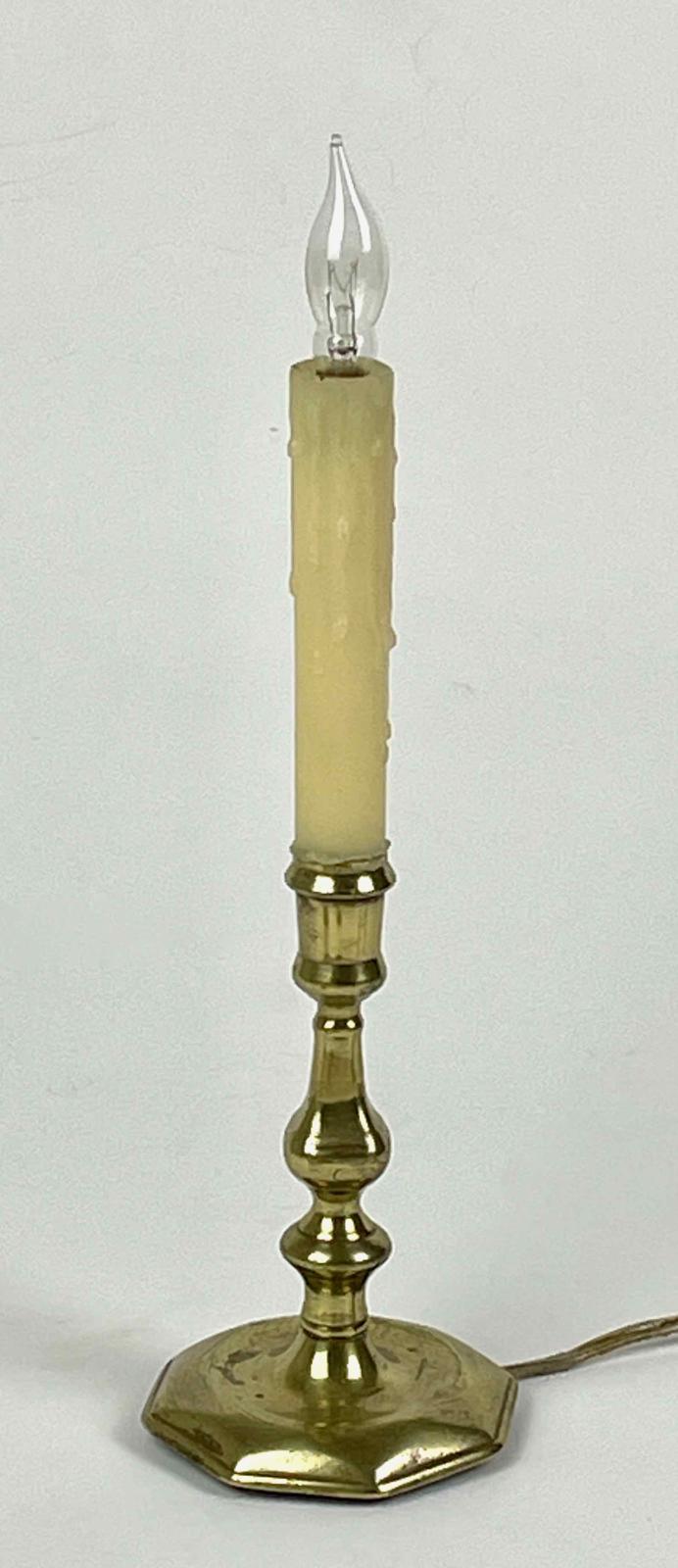 The candlesticks feature a slightly tapered candle socket with no bobeche at the top, only a think ring. Below the socket is a squared baluster atop a reel and an inverted baluster. The shaft stands on a domed, octagonal base.