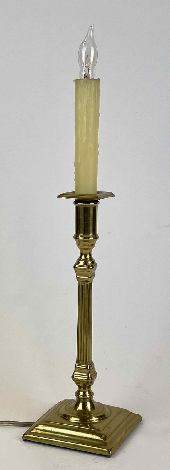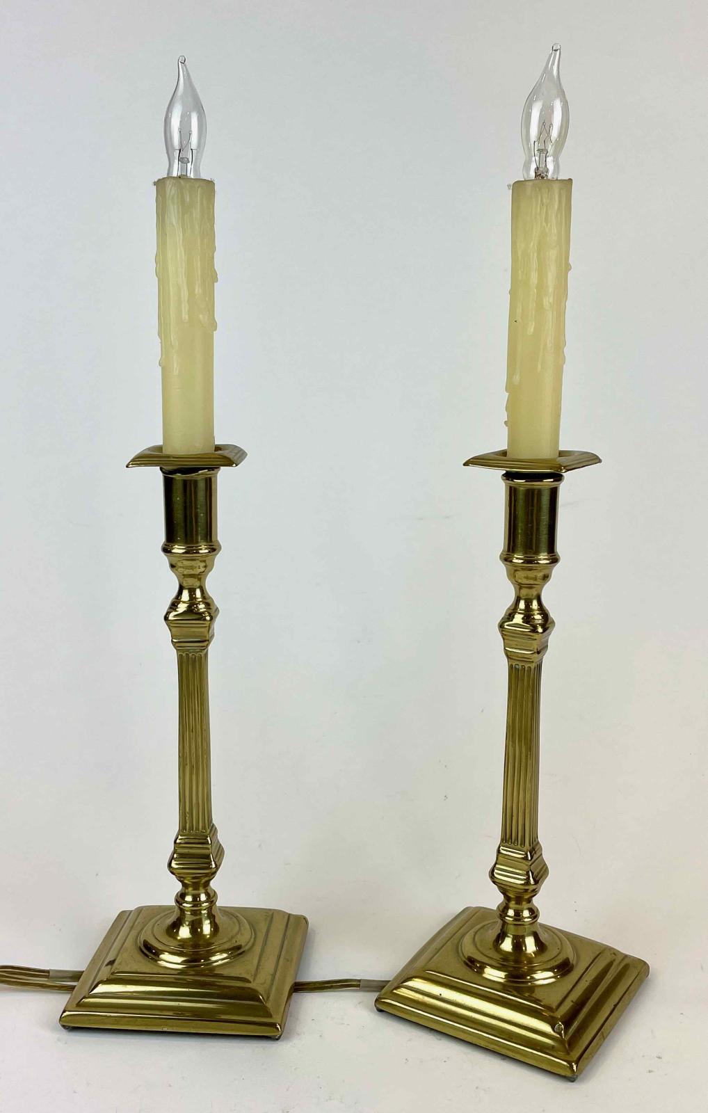 The pair of candlesticks was electrified. Beads of solder have been added at each corner of the base to provide space for the electric wire.