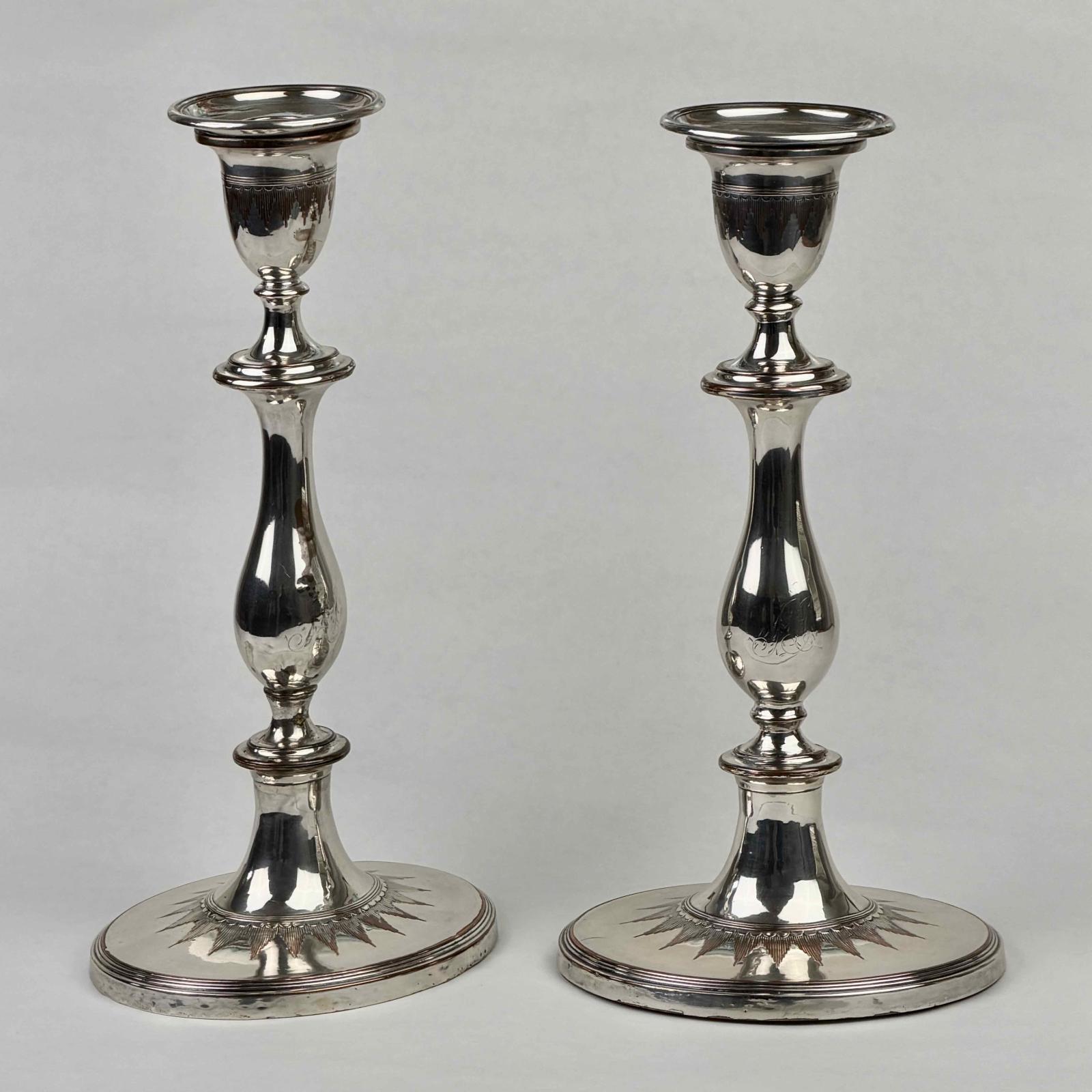 Ex coll. Mrs. E. Tatnall (Mary Corbit) Warner. The pair of candlesticks is part of a group of objects that can be tied directly to Ann Jefferis (1791-1822), who married David Wilson Jr. about 1808, by the engraved initials and the provenance. For further details, see the hot-water urn, accession no. 1971.550, and a coffee service, accession nos. 1972.108-.111.