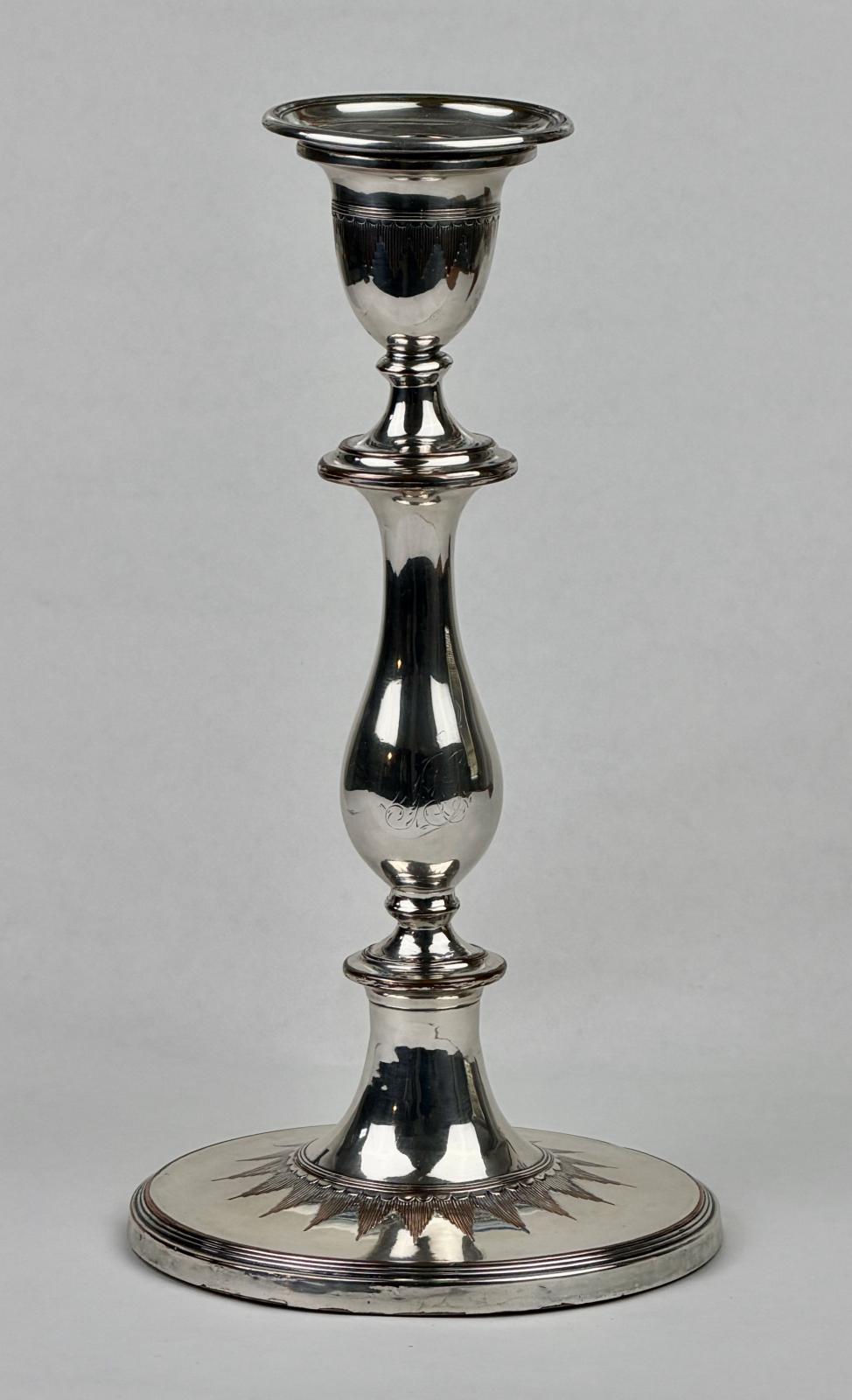 Each of the pair of large candlesticks has a bold baluster shape in the middle of the shaft. The baluster is ovoid in cross-section, conforming to the oval shape of the domed foot, the candle cup, and the removable bobeche. Decorative bands of narrow, side-by-side triangles formed by parallel ribs encircle the top of the candle cup and the top of the base. Each stick bears the engraved initials “AJ” for Ann Jefferis. Other objects in the collection that were likely also part of her 1808 wedding gifts are a coffee service, accession nos. 1972.108-.111, and a hot-water urn, accession no. 1971.550.