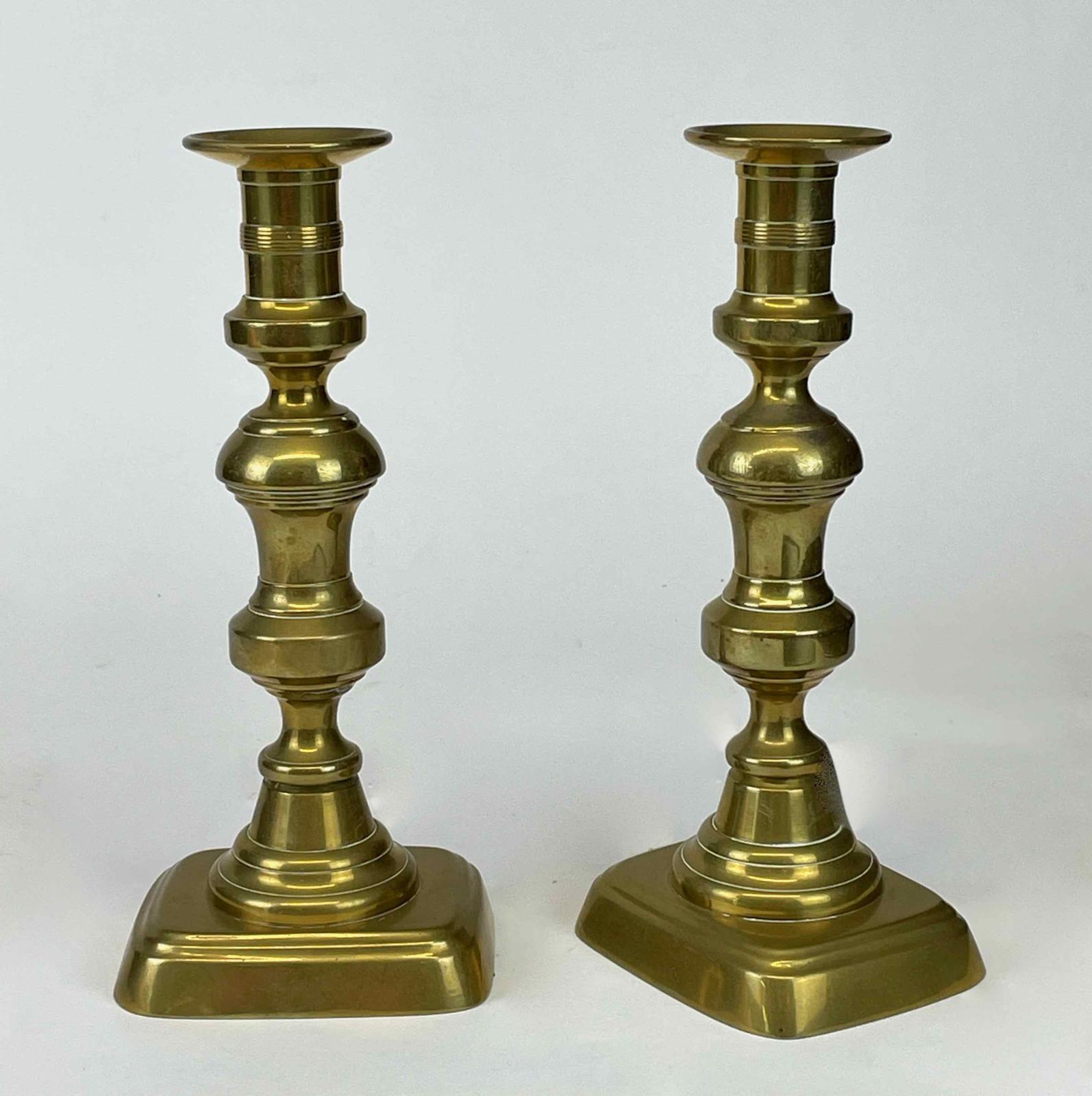 This pair of candlesticks exhibits design and construction features that suggest a late 19th or early 20th century origin. The design if far more complex than earlier examples. The candle socket, for instance, has five narrow rings around the cylindrical section in place of a single broader ring. Additional decorative rings and lips appear throughout the many turned shapes. The base is rectangular, rather than square. The candlestick was made in two parts and soldered together. The solder line is immediately above the short cone above the base in lowermost rings.