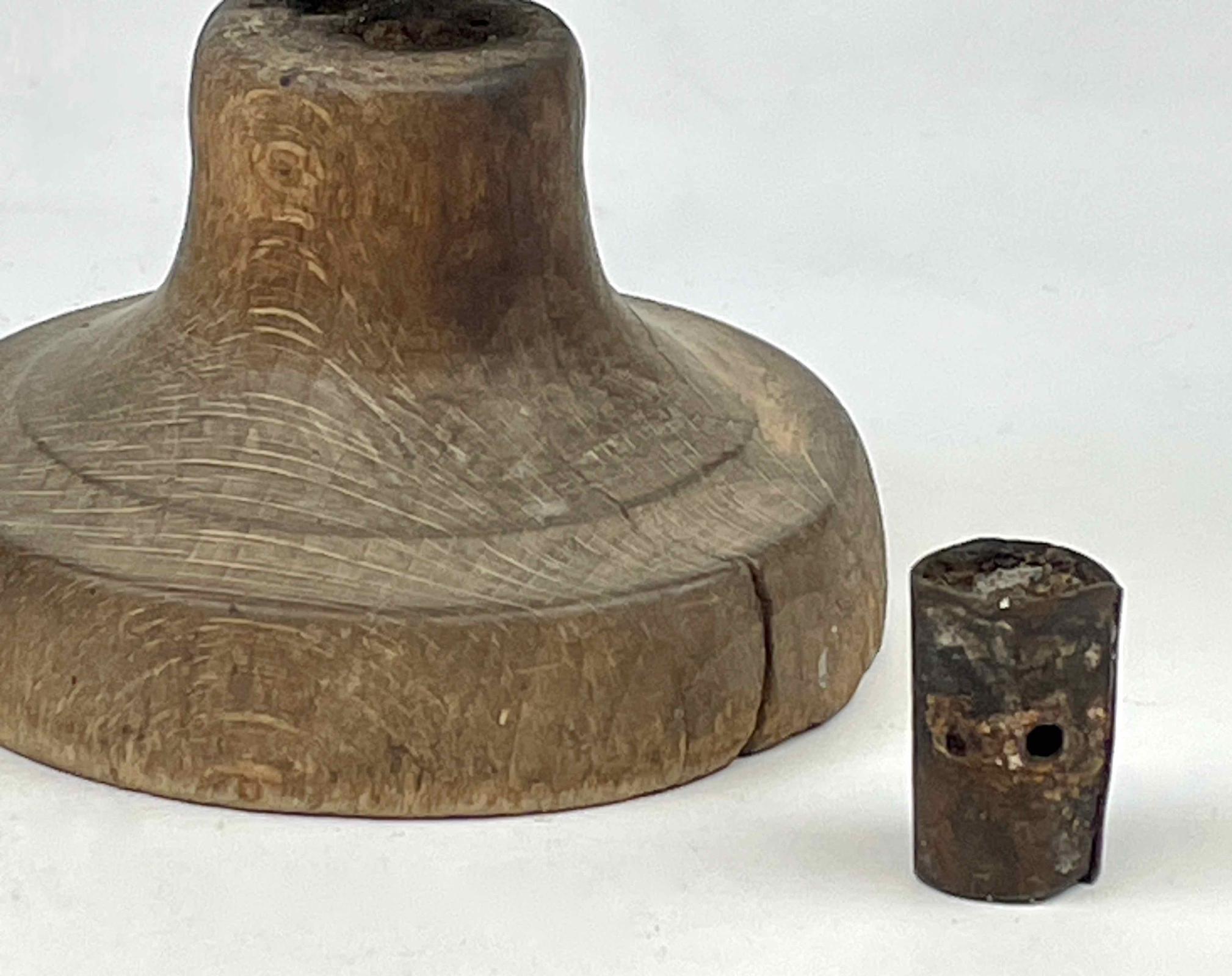 The handle to raise and lower the candle ejector of candlestick 1969.269.1 has broken off, and the ejector base is now loose inside the stick. The once round base has shrunk to an oval. It has a split in one side and is likely a later replacement.