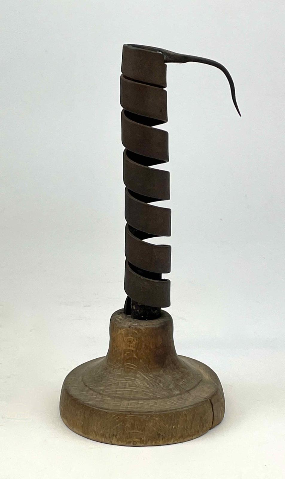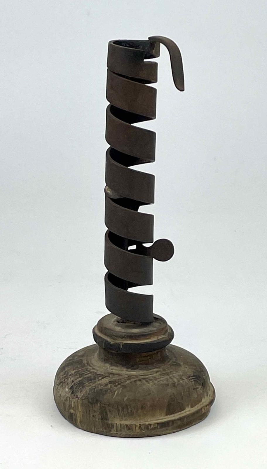 These two similar candlesticks are made of iron coiled around to form an open spiral that forms a candle socket. The height of the burning candle can be adjusted by raising or lowering a sliding ejector, visible on 1969.269.2. The tab on .1 has broken off, leaving the ejector base loose. A tang or extension at the base of the coiled candle socket allows it to be mounted onto a turned wood base. At the top, another tab or finger grip forms a convenient means for the user to move the candlestick.