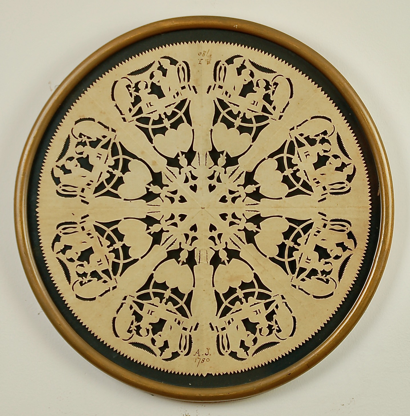 The circular cutwork picture, now housed in a circular frame, was folded to create eight cutwork pie-shaped sections; each section reverses the cutwork on the flanking sections. The cut images feature outlines of an adult sitting in a chair with a vertical splat in its back. Two children, one sitting, appear to be reading books in front of the adult. Behind them is a large parrot. Below this vignette, in the center, the cutwork incorporates some bird-like shapes and hearts. The outer border of the picture is serrated.