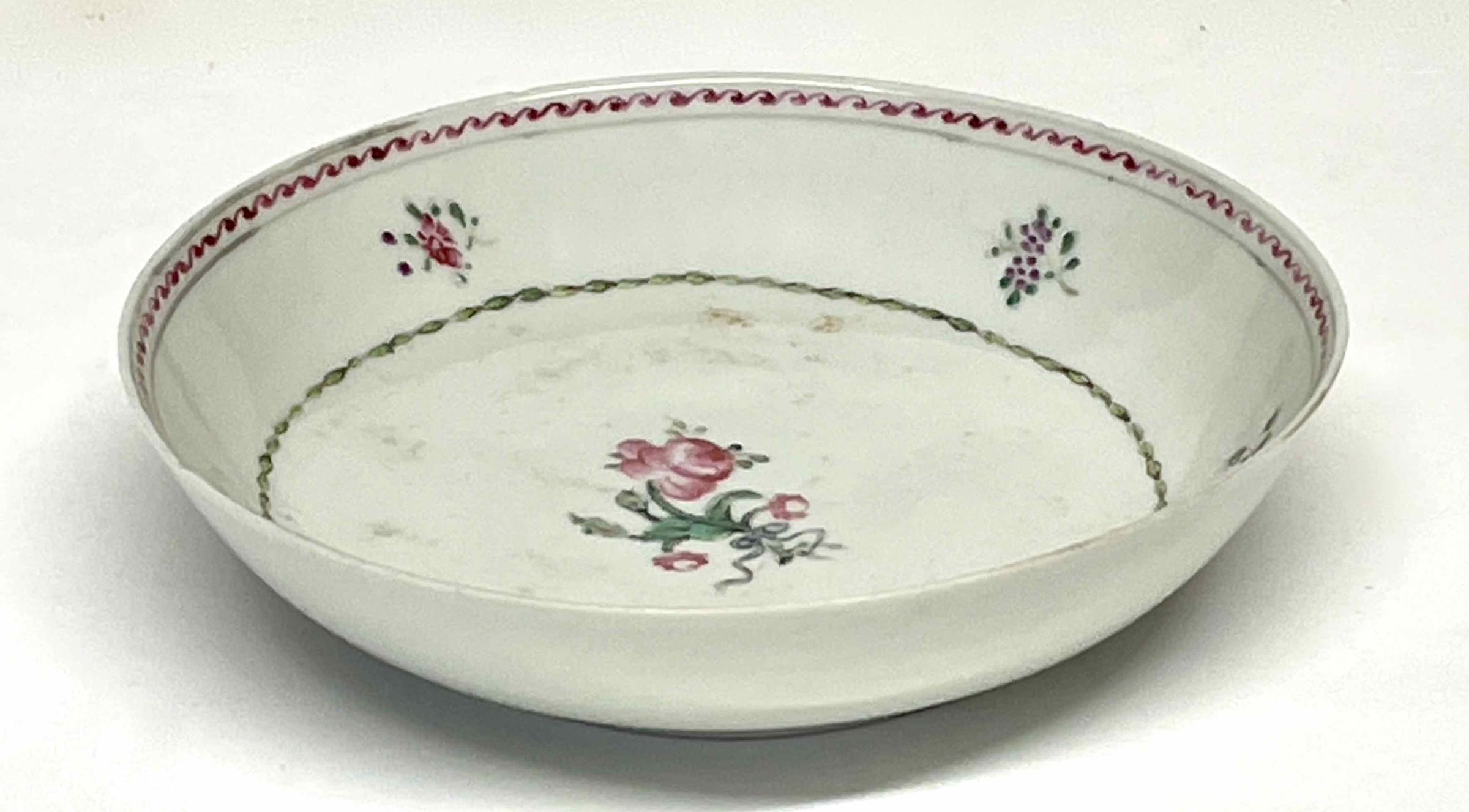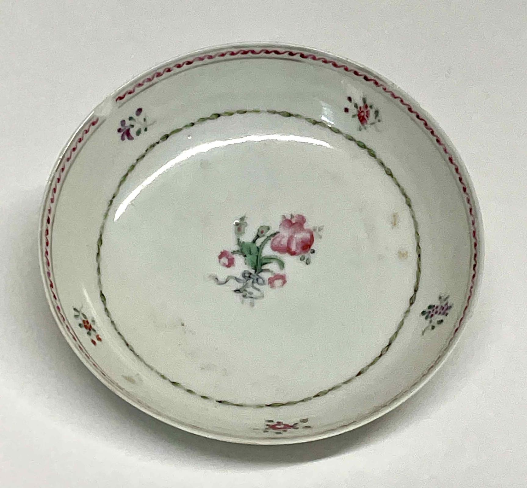 The high-sided saucer is enameled in pink, green, and blue. It has a wavy border around the inside of the rim, above five small floral sprays and a second border in green. A pink and green floral motif is in the center of the bottom.