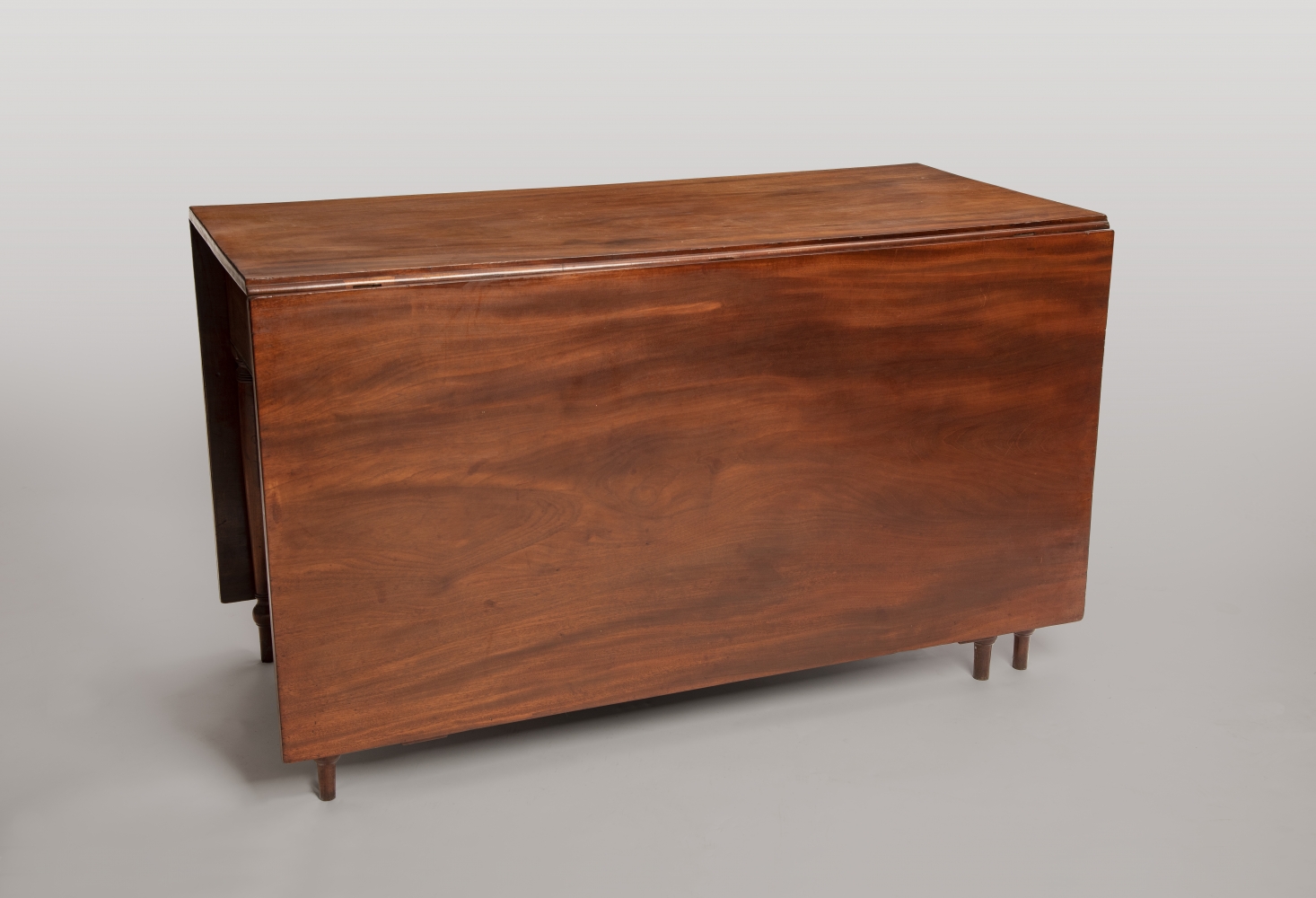 The rectangular table, made of dense, heavy mahogany, has six turned legs and two deep leaves supported by legs that swing out from the frame. A bead runs along the bottom edge and across the leg stiles of table frame ends. The bottom edge of each leaf has projecting leaf-edge tenons designed to fit into leaves of accompanying D shaped end tables. Thus, this drop-leaf table is the center section of what was once an ensemble of three tables. The end sections did not accompany this center section when it was bequeathed to The David Wilson Mansion, Inc.