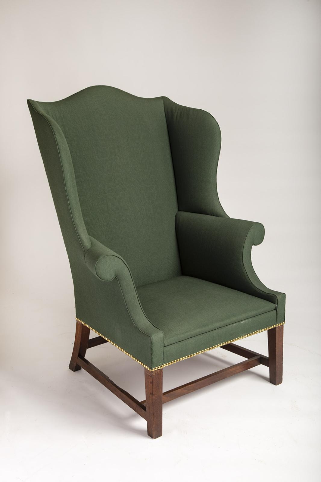 This chair is upholstered in a green plain-woven wool, which is an accurate covering for such a chair. A related easy chair at Historic Odessa (accession no. 1986.11) retains a small strip of its original upholstery, published as fig. 56 in Philip D. Zimmerman, A Storied Past: Collections of Historic Odessa (Odessa, DE: Historic Odessa Foundation, 2023), 101.