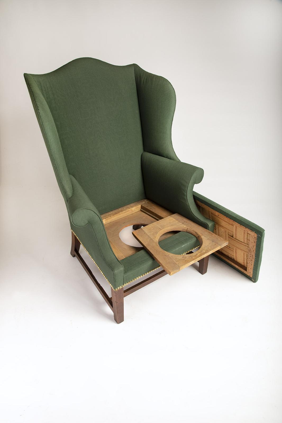 The easy chair has the general shape and secondary woods of other examples thought to have been made in Massachusetts. The legs on this chair taper slightly, which represent one of its latest features. The chair preserves the original framework to support a chamber pot underneath the slip seat. Later "chamber chairs" of this stylish sort, i.e., those made after about 1810, had sliders built into the chamber pot framework that allowed the pot to be accessed for cleaning from behind the chair and without disturbing the slip-seat cover.