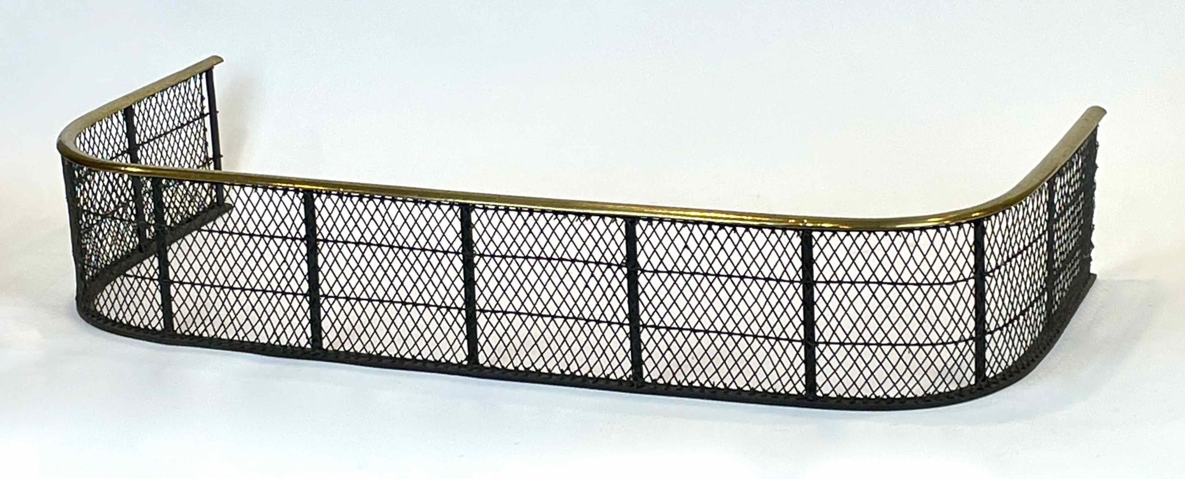 Fireplace fenders protected the floor and any floor coverings in front from burning embers or worse that may have originated in the fire. This example is basic, having a low screen of iron wires. These wires cross forming a lattice, instead of simply standing upright in parallel. The frame of the fender has an iron rail at the top and bottom, separated by eleven uprights. The iron top rail is wrapped in thin sheet brass.