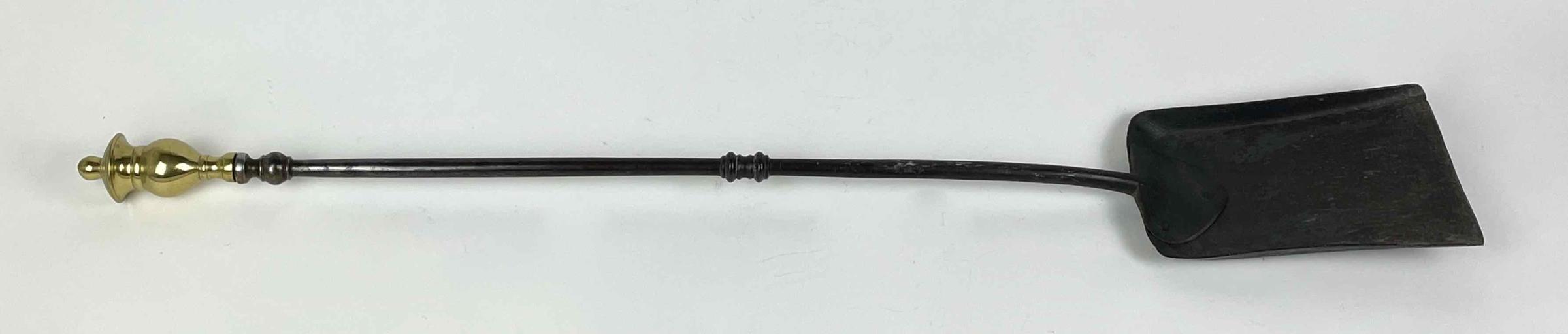 The design of this fireplace shovel is similar to early (pre-1850) examples but differs in almost every detail. The shovel section is essentially rectangular rather than flared. More important, it attaches to the handle shaft in an unusual manner. The shaft ends in a thick triangular tab that is peened to the top of the shovel blade in three places, producing an attachment that is very strong and wasteful of materials. The shaft has a decorative knop in the center that is more complex than normal. Similarly, the knops adjacent to the brass handle have few, if any, early counterparts. The brass handle is of an uncharacteristic shape. It is not cast in halves and seamed, although it is peened in place at the tip.