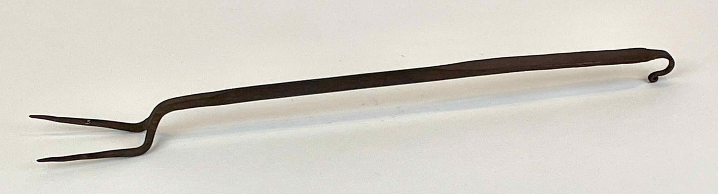 Cooking forks, called flesh forks, were ubiquitous and were made by almost all local blacksmiths. They did not change much over the generations, making dating them or identifying place of origin difficult. This fork has a long shaft flattened at the handle end. It tapers at the handle tip to a thin hook that ends in a curl. At the opposite end, the iron bar was bent downward and split into two rounded and pointed tines that were bent at almost right angles.