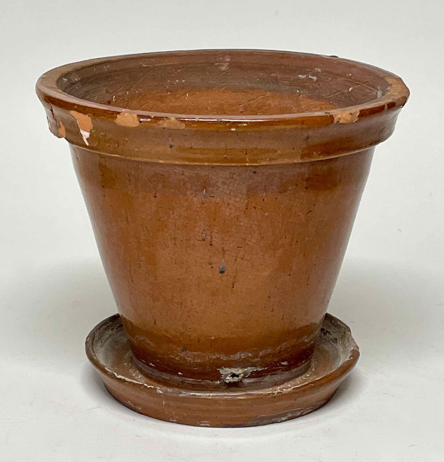 The flower pot is in the shape of a conical cylinder with a thick banded rim at the top. The rim band has a gently curved hollow on the outside surface. The bottom of the pot has an applied, flat-bottomed saucer. A drain hole on one side allows water in the pot to drain into the saucer. The pot is glazed on the outside surface only.