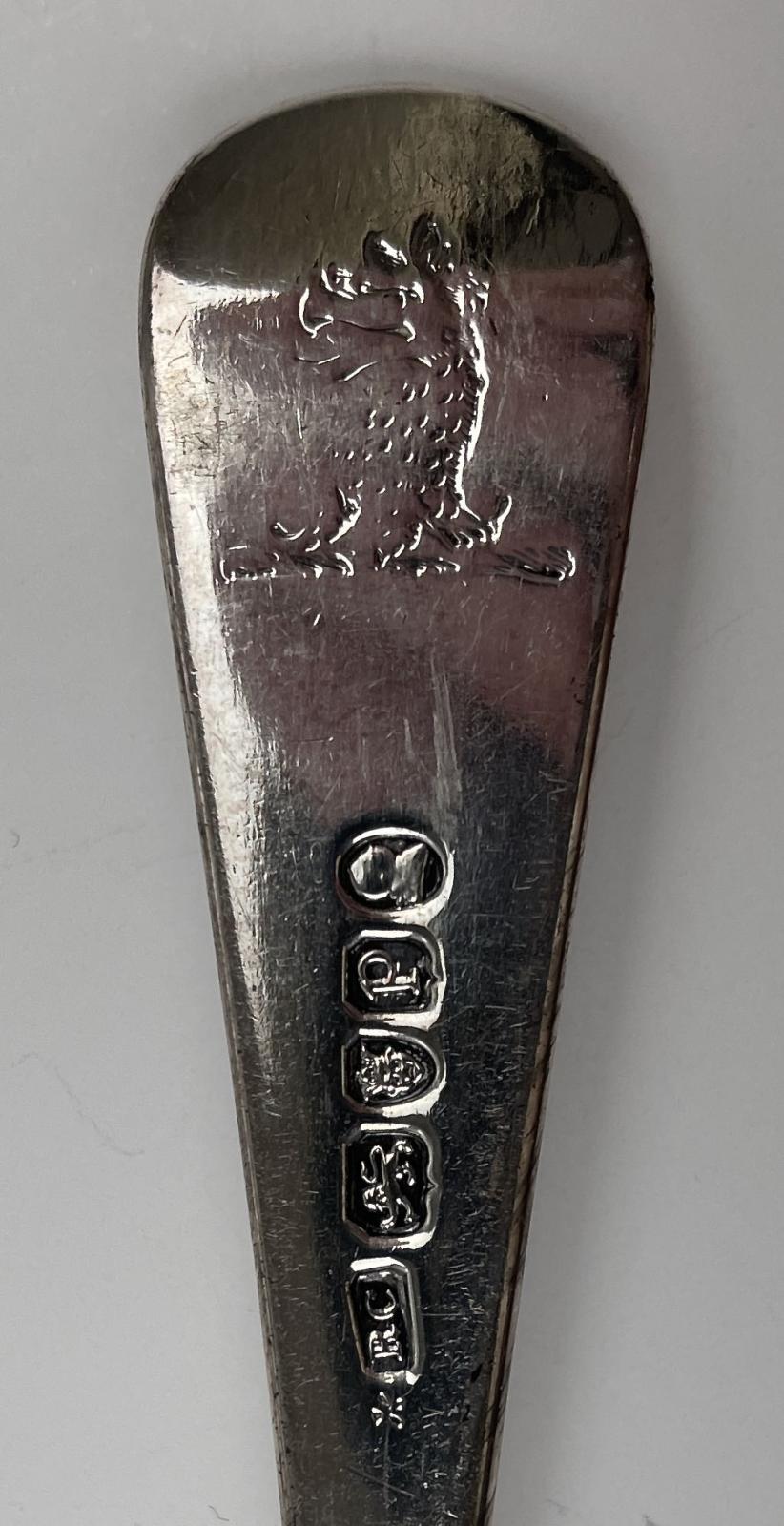 An "RC" touchmark accompanies four London hallmarks, including a date letter "p" and lion passant. An engraved crest on the underside of the handle shows an heraldic wreath supporting a griffens head.