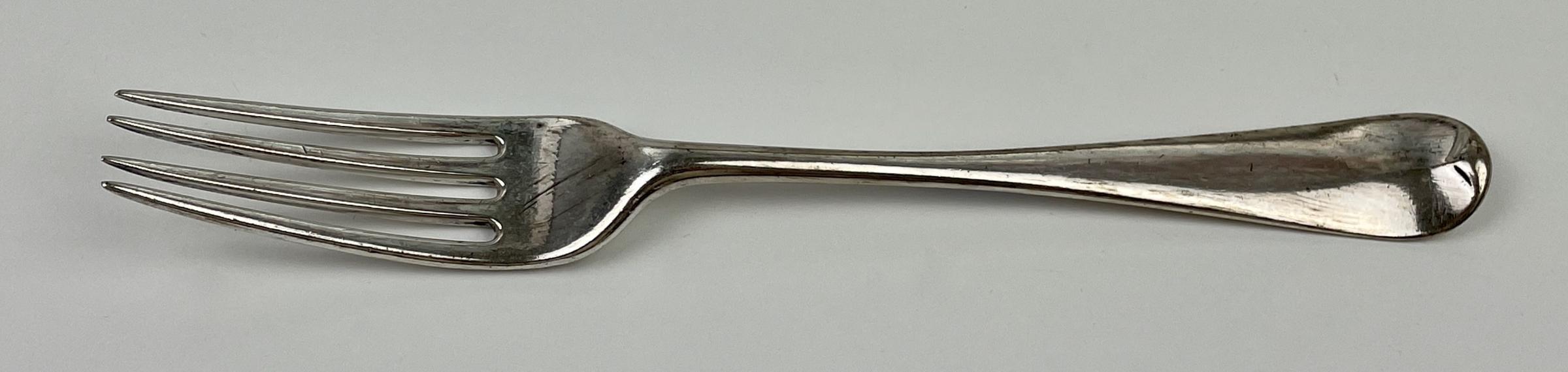 The four-tined silver fork has a rounded handle with an upturned tip.